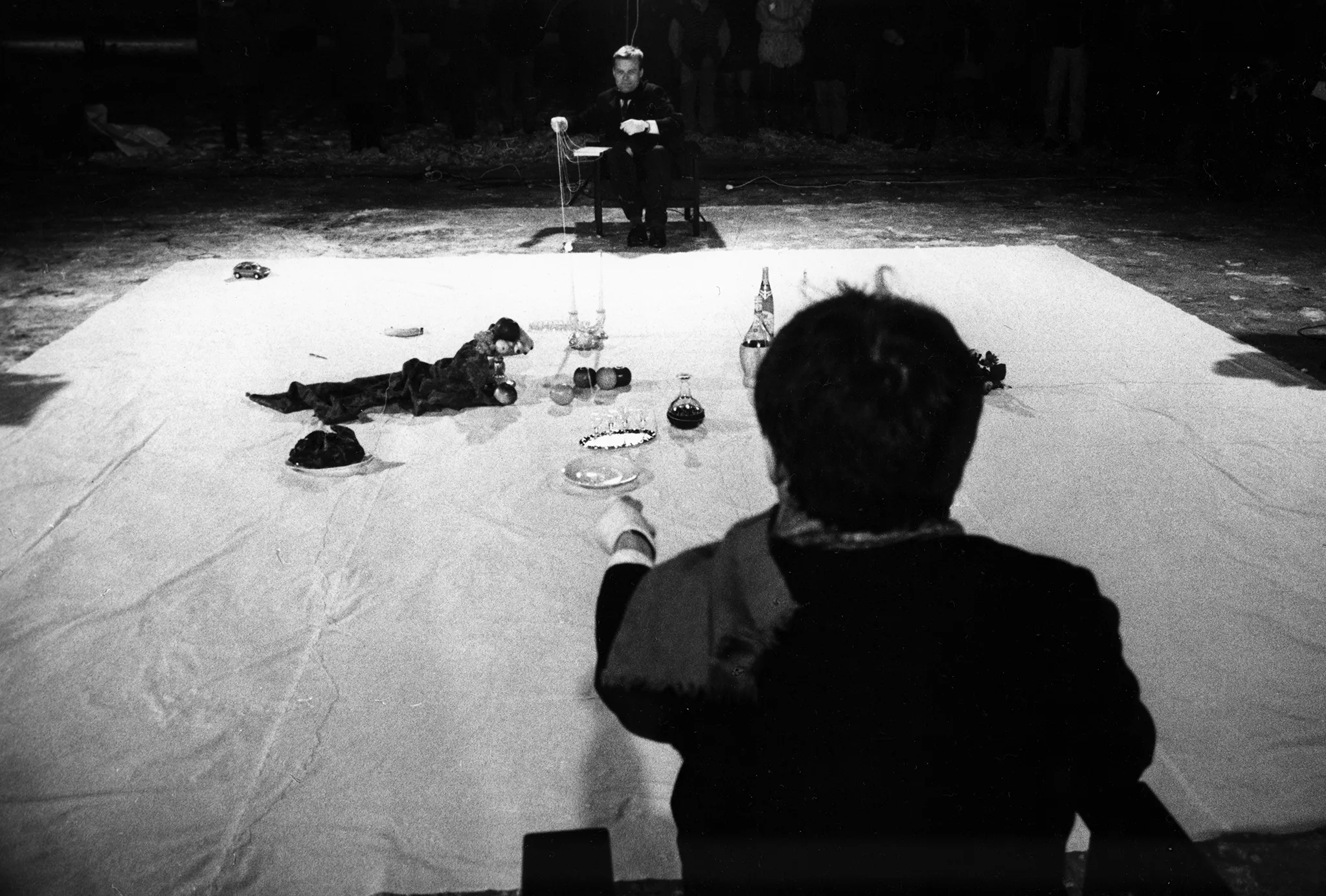 Na białej płachcie leżą przedmioty, takie jak kieliszki, świece, owoce i butelki. Po lewej stronie płachty na krześle siedzi aktor. Ubrany jest na czarno. W rękach trzyma książkę i mówi coś do aktora siedzącego na krześla po drugiej stronie płachty. Z tyłu płachty na krześle siedzi aktor trzymający w rękach napiętą linkę. Za jego plecami stoi reflektor i grupa widzów.