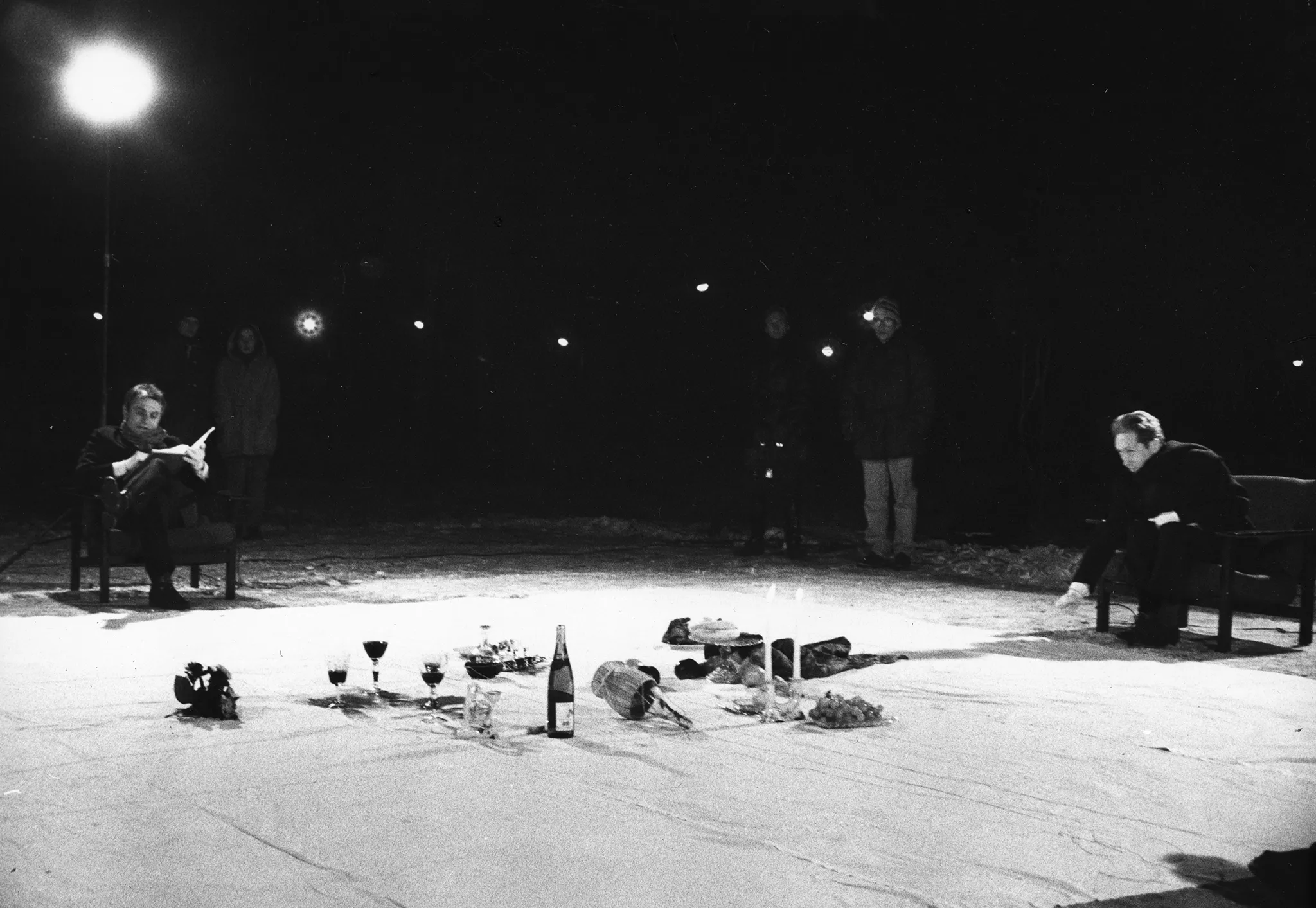 Na białej płachcie leżą przedmioty, takie jak kieliszki, świece, owoce i butelki. Po lewej stronie płachty na krześle siedzi aktor. Ubrany jest na czarno. W rękach trzyma książkę i mówi coś do aktora siedzącego na krześla po drugiej stronie płachty. Z tyłu płachty na krześle siedzi aktor trzymający w rękach napiętą linkę. Za jego plecami stoi reflektor i grupa widzów.
