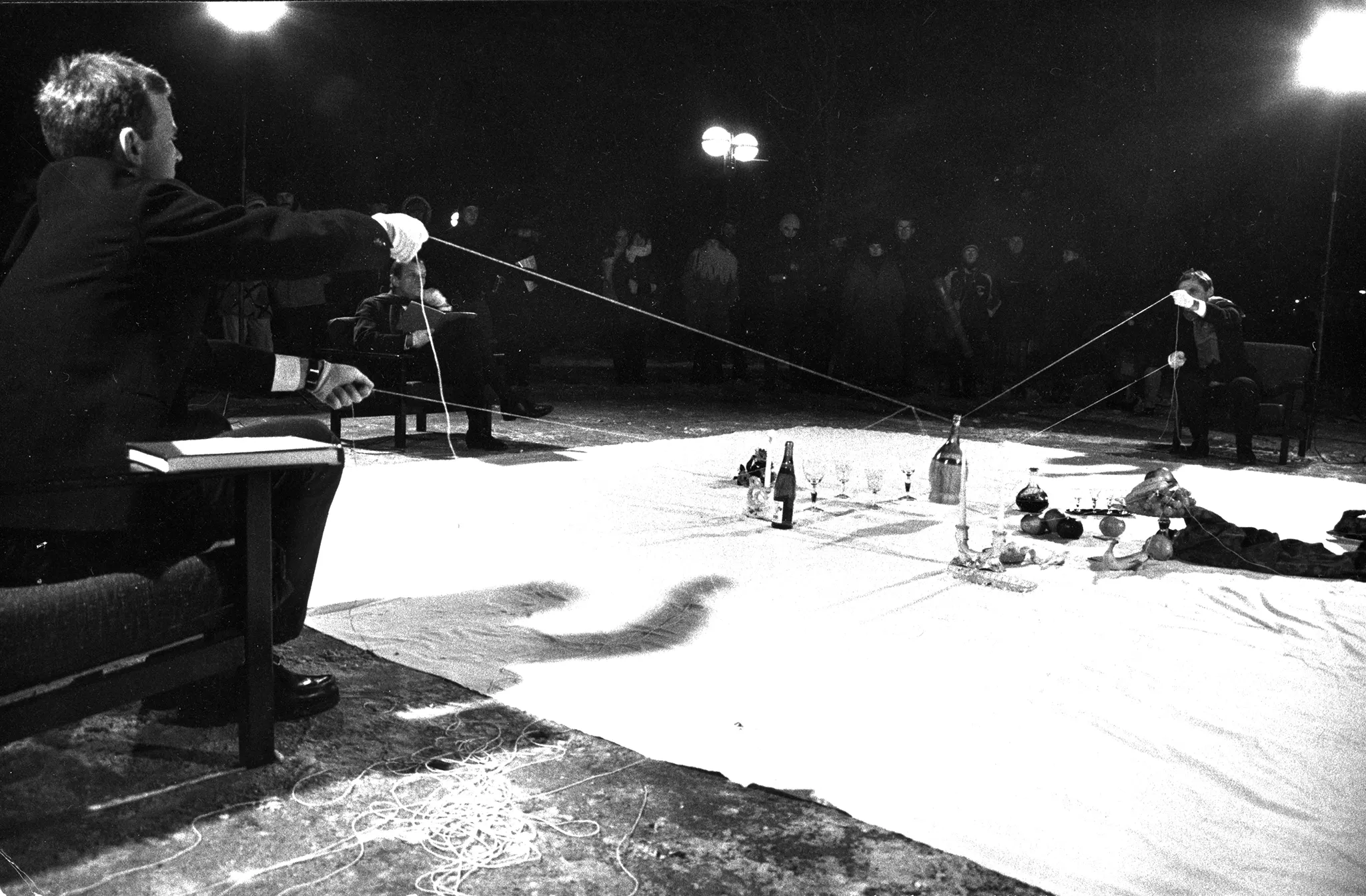 Na białej płachcie leżą przedmioty, takie jak kieliszki, świece, owoce i butelki. Po lewej stronie płachty na krześle siedzi aktor. Ubrany jest na czarno. W rękach trzyma książkę i mówi coś do aktora siedzącego na krześla po drugiej stronie płachty. Z tyłu płachty na krześle siedzi aktor trzymający w rękach napiętą linkę. Za jego plecami stoi reflektor i grupa widzów.
