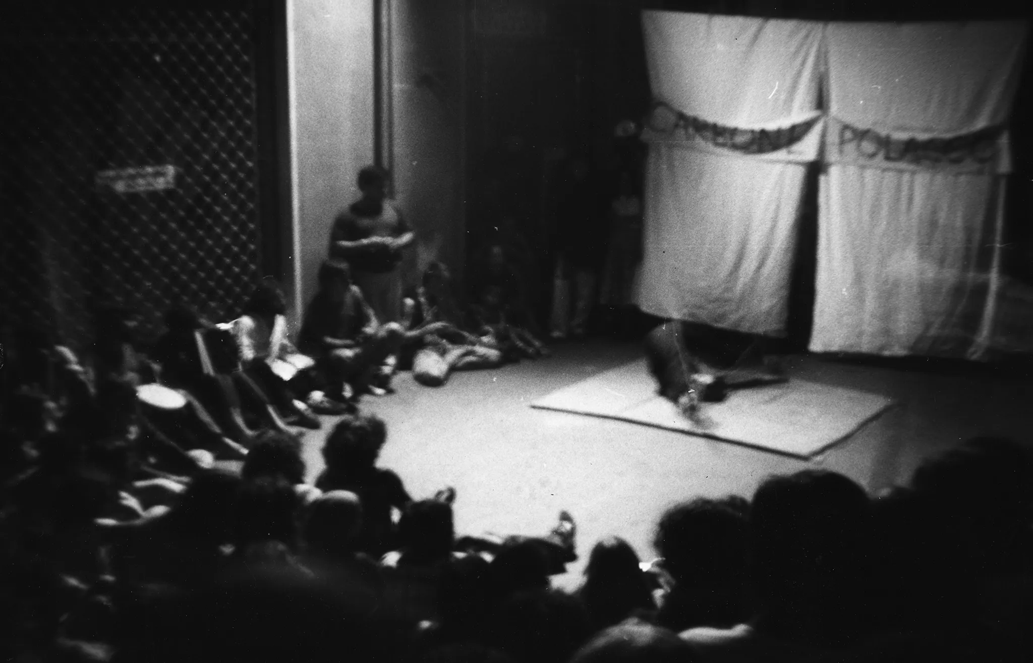 Niewyraźne zdjęcie. Grupa widzów siedzi zgromadzona przy scenie. Na scenie leży jasna mata. Z tyłu sceny wisi biała kurtyna. Na kurtynie wisi biała szarfa z czarnym napisem "CARBONE POLACCO".