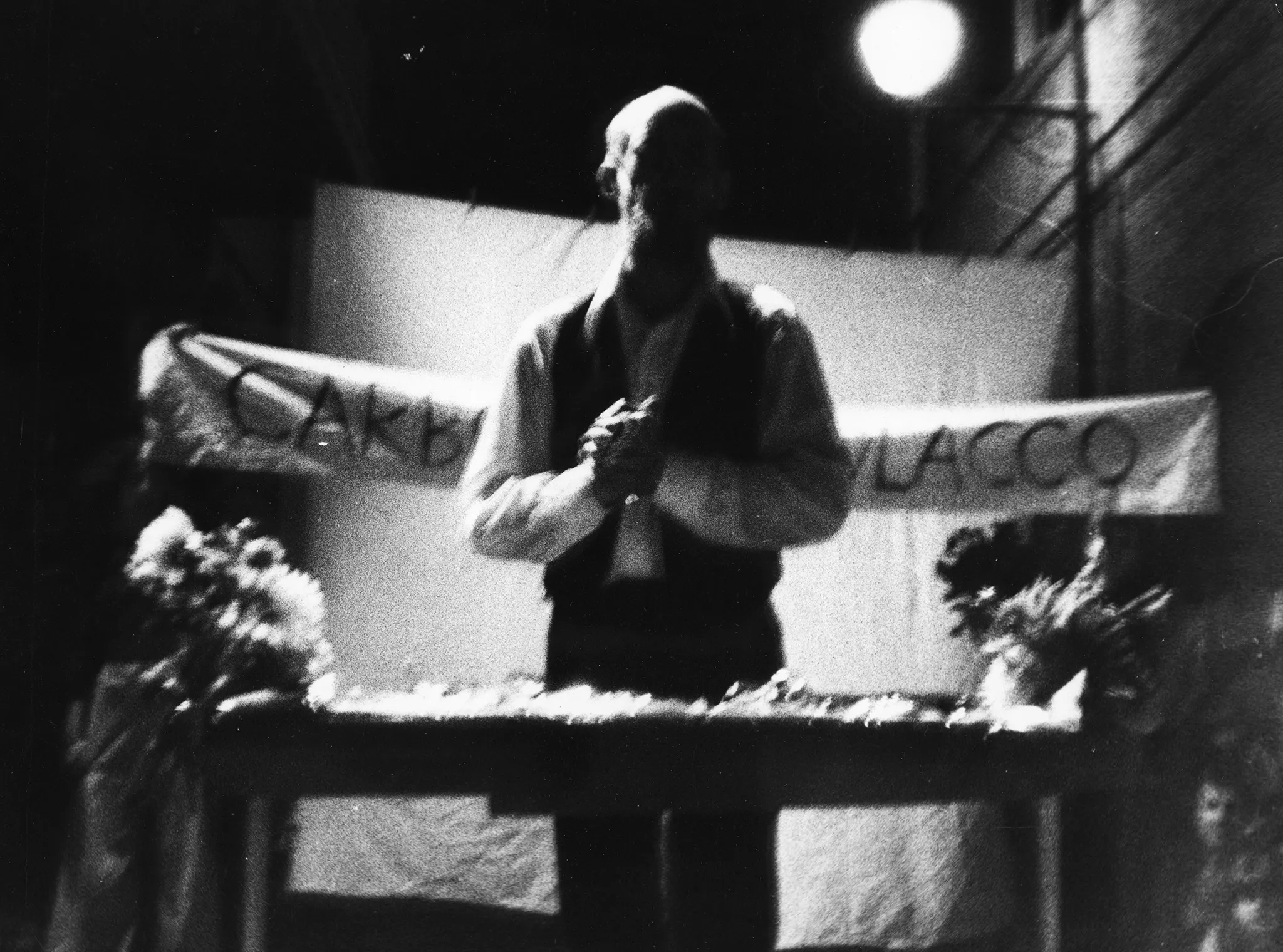 Niewyraźne zdjęcie. Grupa widzów siedzi zgromadzona przy scenie. Na scenie leży jasna mata. Z tyłu sceny wisi biała kurtyna. Na kurtynie wisi biała szarfa z czarnym napisem "CARBONE POLACCO".