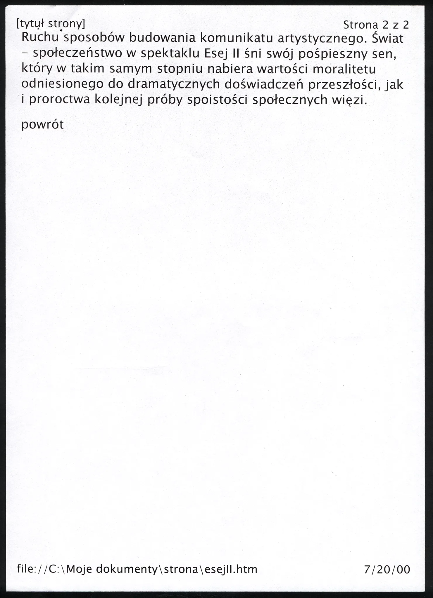 W spektaklu Esej II, który został pokazany w 1999 roku, świat – społeczeństwo śniło swój pośpieszny sen. Nabiera on w takim samym stopniu wartości moralitetu odniesionego do dramatycznych doświadczeń przeszłości, jak i proroctwa kolejnej próby spoistości społecznych więzi.