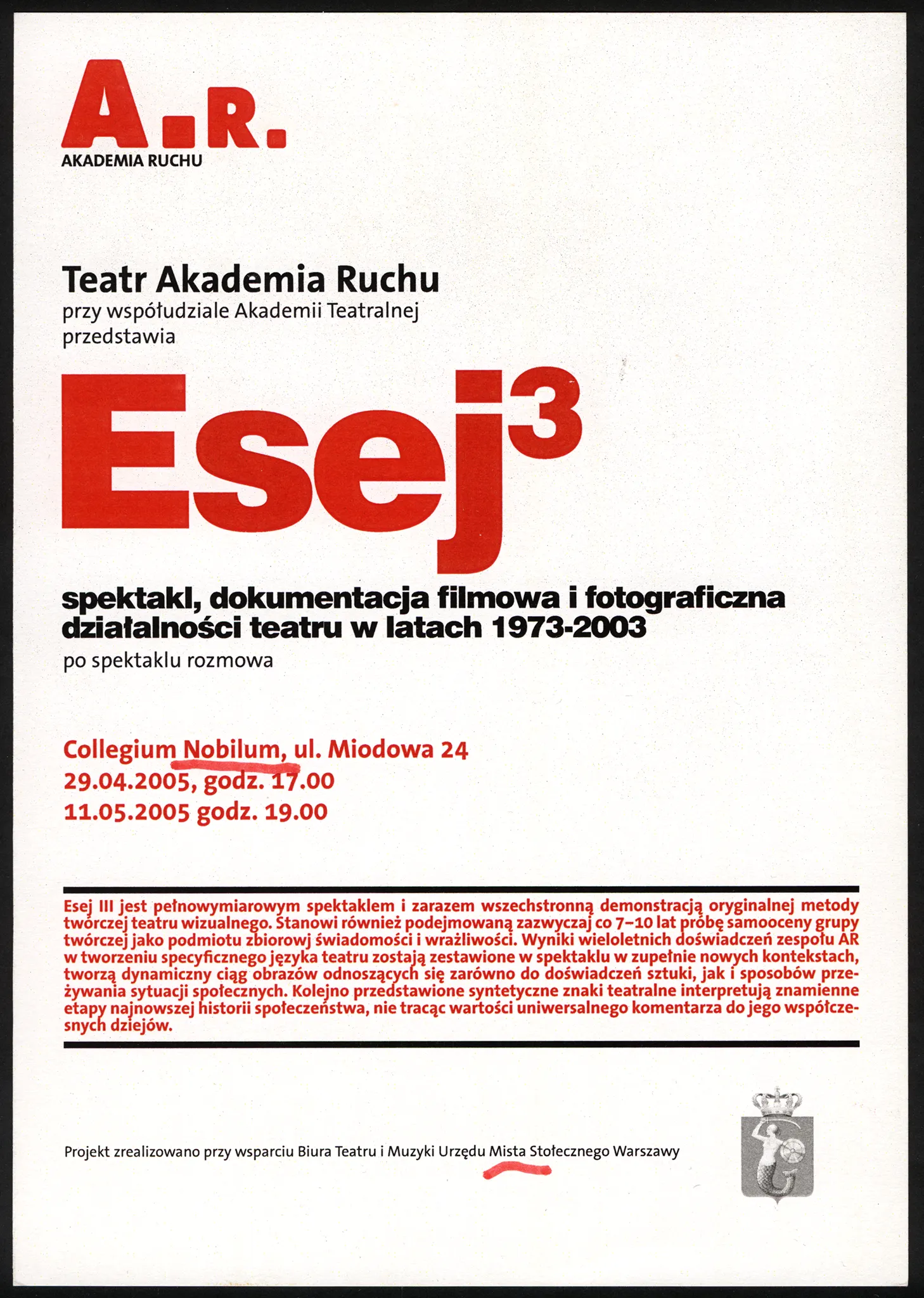 Trzeci wariant spektaklu, którego celem była wszechstronna demonstracja oryginalnej metody teatru wizualnego AR. Esej stanowił, podejmowaną zazwyczaj co siedem, dziesięć lat, próbę samooceny grupy twórczej jako podmiotu zbiorowej świadomości i wrażliwości. Wyniki wieloletnich doświadczeń zespołu AR w tworzeniu specyficznego języka teatru były sytuowane w kolejnych wersjach Eseju w zupełnie nowych kontekstach. Stanowiły dynamiczny ciąg obrazów odnoszących się zarówno do doświadczeń sztuki, jak i sposobów przeżywania sytuacji społecznych.