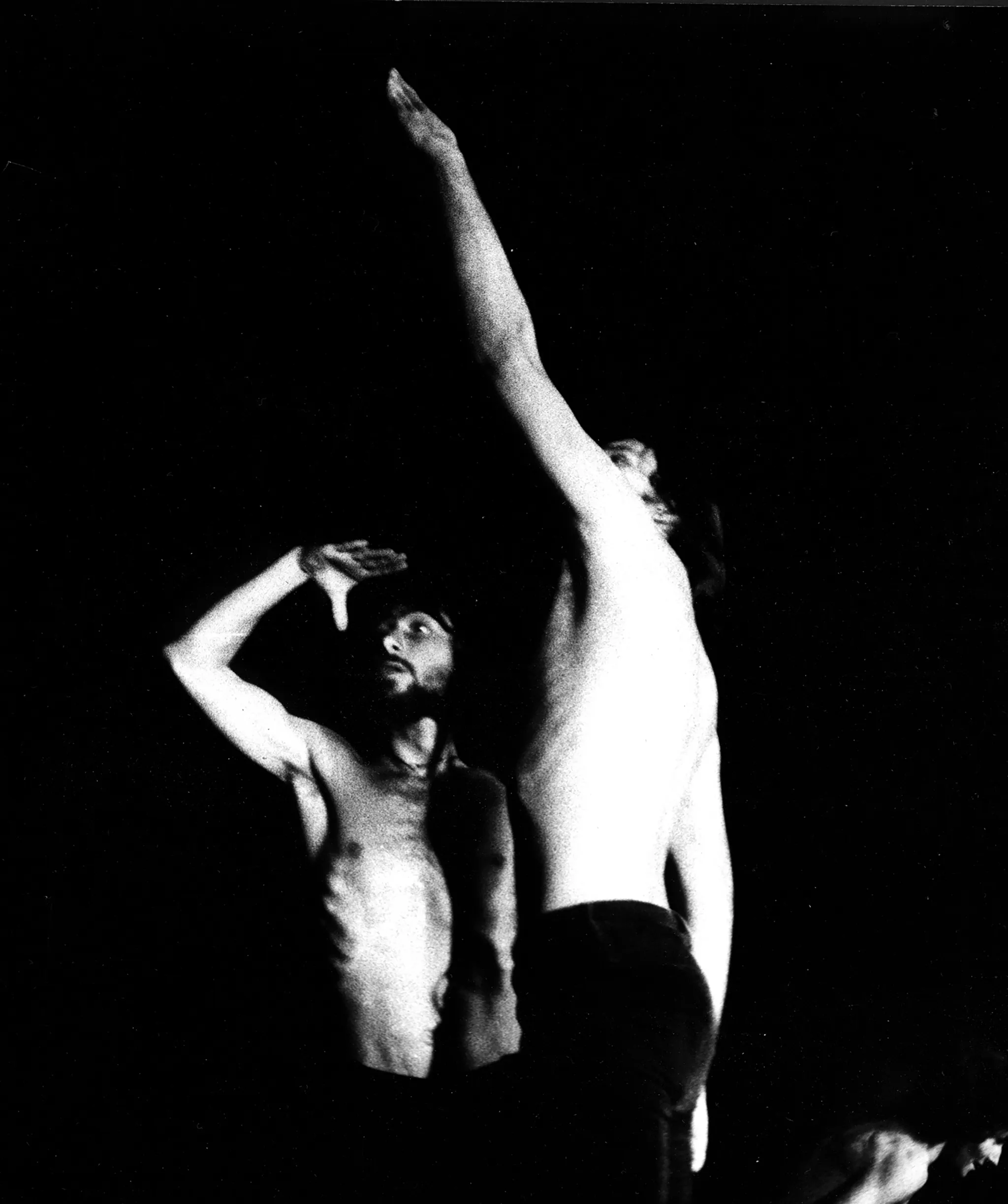 Dwóch aktorów stoi blisko siebie. Obaj mają nagie torsy. Patrzą w dal. Aktor z lewej strony ma lekko uniesioną, zgiętą rękę. Aktor z prawej strony ma rękę wyprostowaną, uniesioną wysoko w górze.
