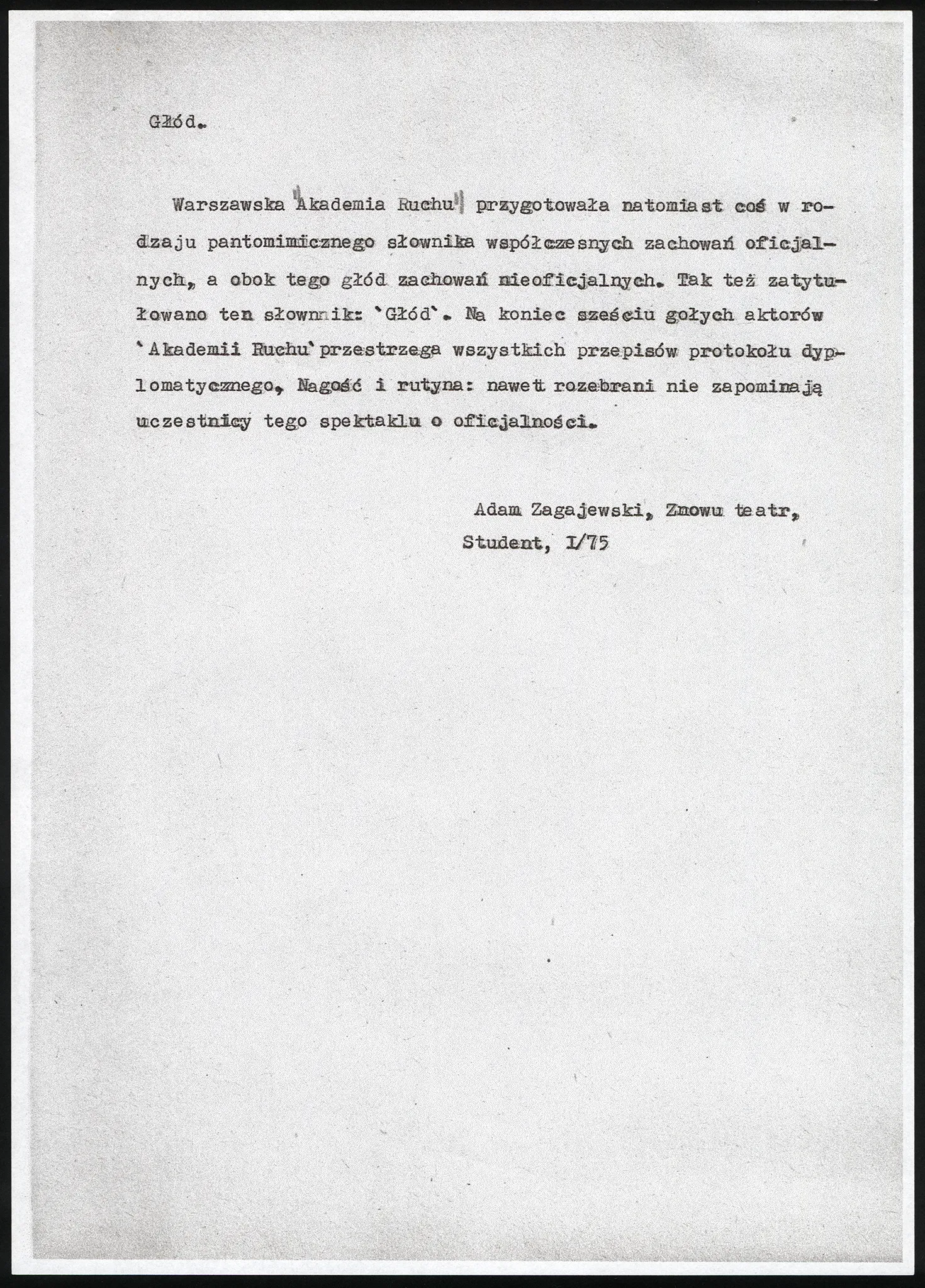 Sekwencja Głód prezentowała słownik póz i znaków wizualnych wyrażających postawę zaangażowaną Polaków roku 1974. W ramach jej finalnej części sześciu nagich aktorów odtworzyło, w formie precyzyjnych układów oryginalnej choreografii, rytuały oficjalnych zachowań przedstawicieli władzy, cechujących życie publiczne PRL.