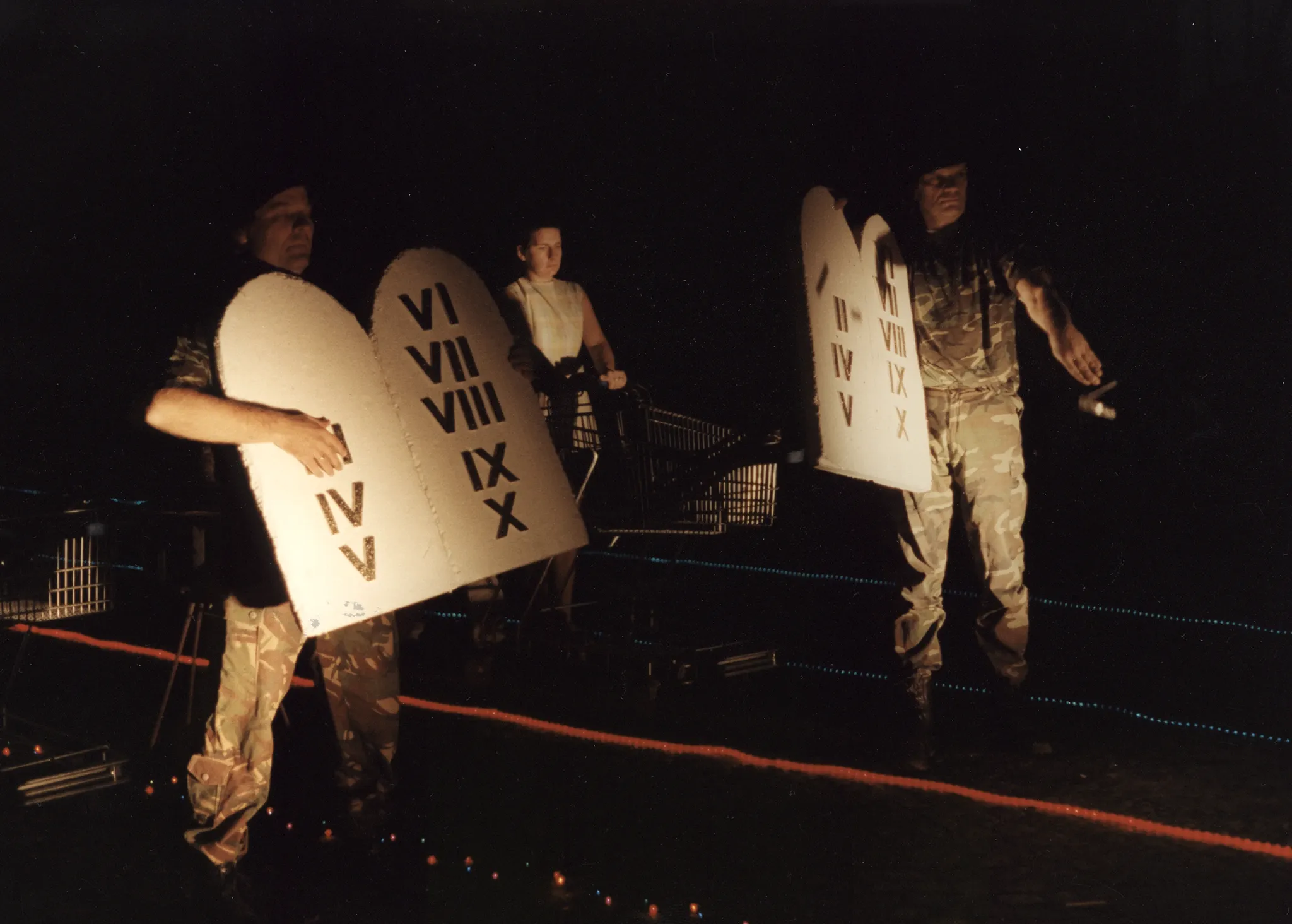 Noc. Na piasku leżą trasy wyznaczone przez czerwone i niebieskie lampki. Pośród lampek stoją aktorzy i wózki sklepowe. Dwóch aktorów w ubraniach wojskowych trzyma tablice z rzymskimi cyframi kończącymi się na "X". Tablice przypominają Dekalog. Aktorzy odrywają w tablic kolejne cyfry i rzucają je na ziemię.