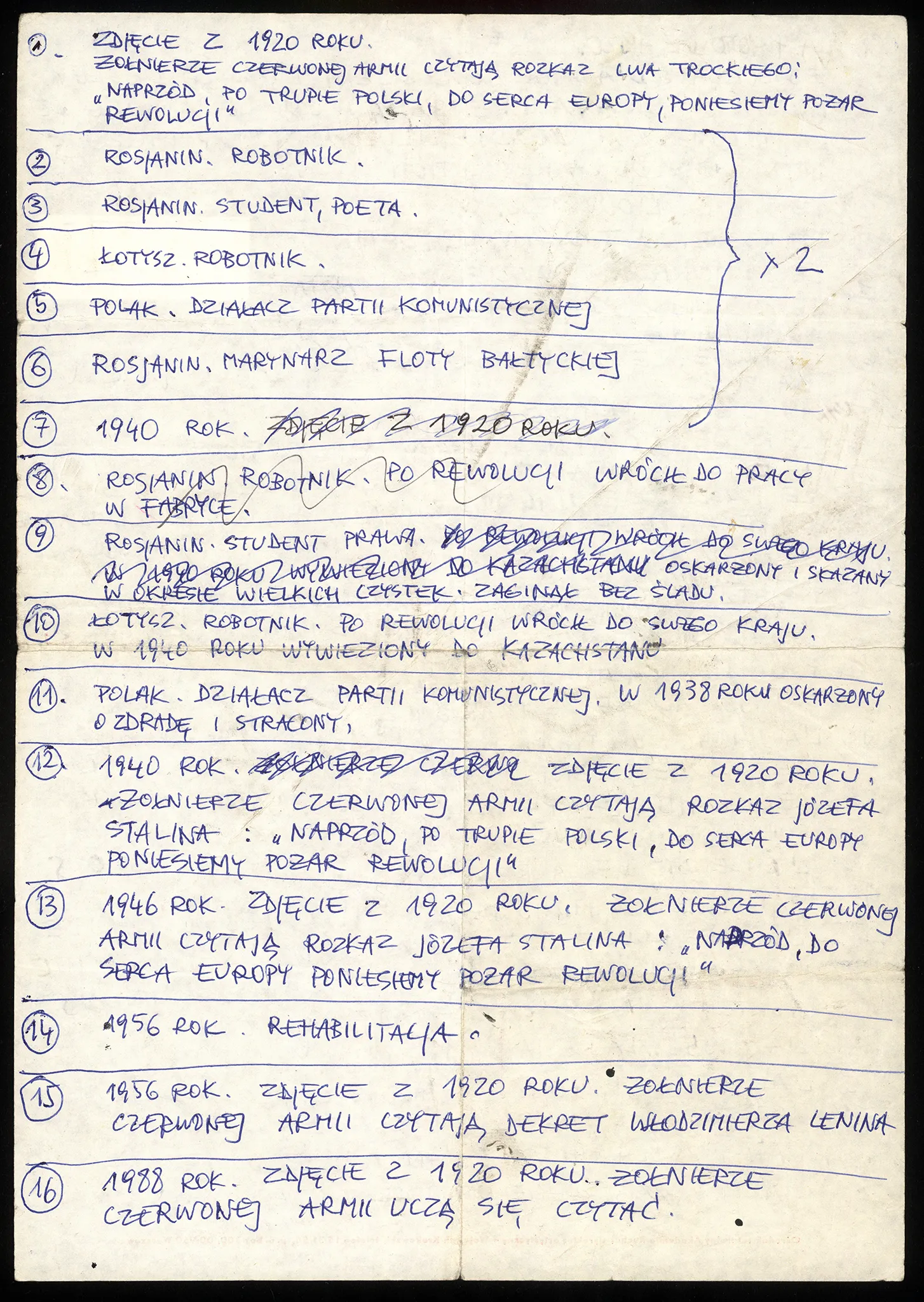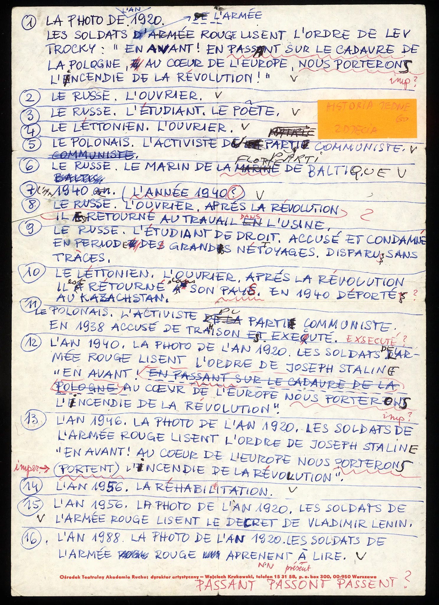 akcja Historia jednej fotografii (1988) Historia jednej fotografii → Historia pewnej fotografii – notatki reżyserskie po polsku i po francusku notatki reżyserskie, kolor 1988 notatki reżyserskie Historia pewnej fotografii – notatki reżyserskie po polsku i po francusku data 1988 format kolor kolor osoby widoczne miejsce copyright czas trwania opis