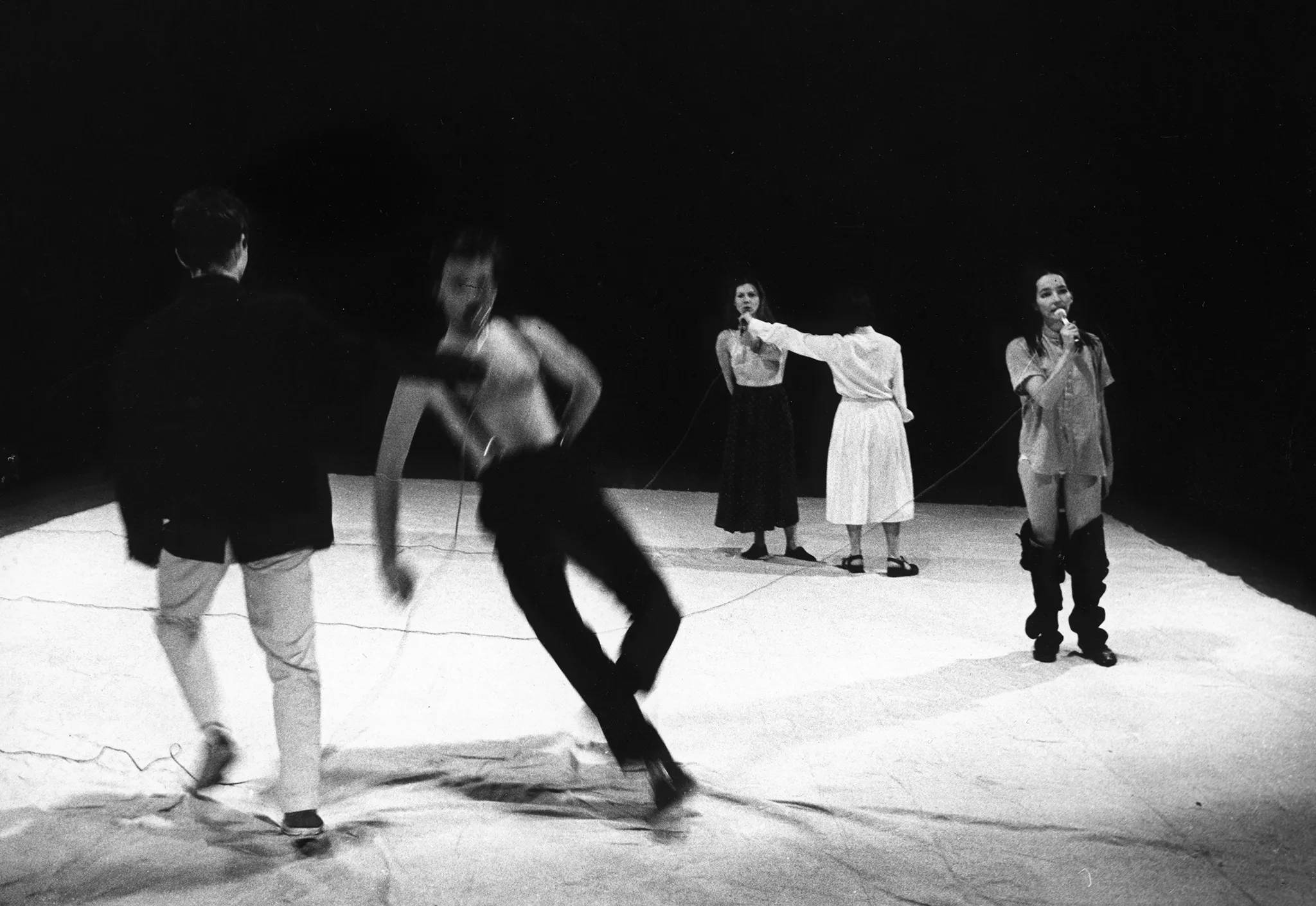 Niewyraźne zdjęcie. Na białej płachcie stoją trzy aktorki i jeden aktor. Aktorki ubrane są w spódnice i staniki. Aktor jest ubrany w jasne spodnie i ma nagi tors. Wszyscy wyglądają, jakby tańczyli.
