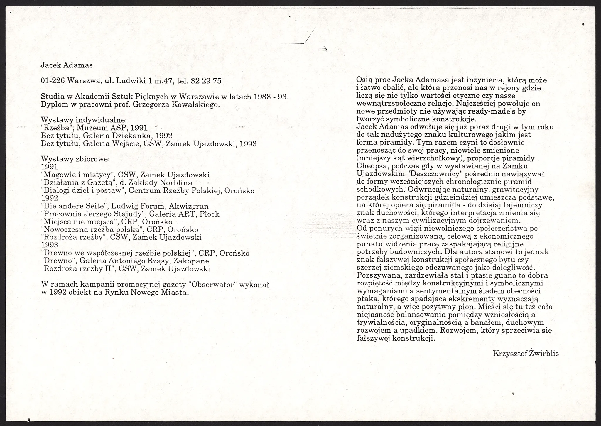 J. Adamas, Rzeźba – ulotka do wystawy