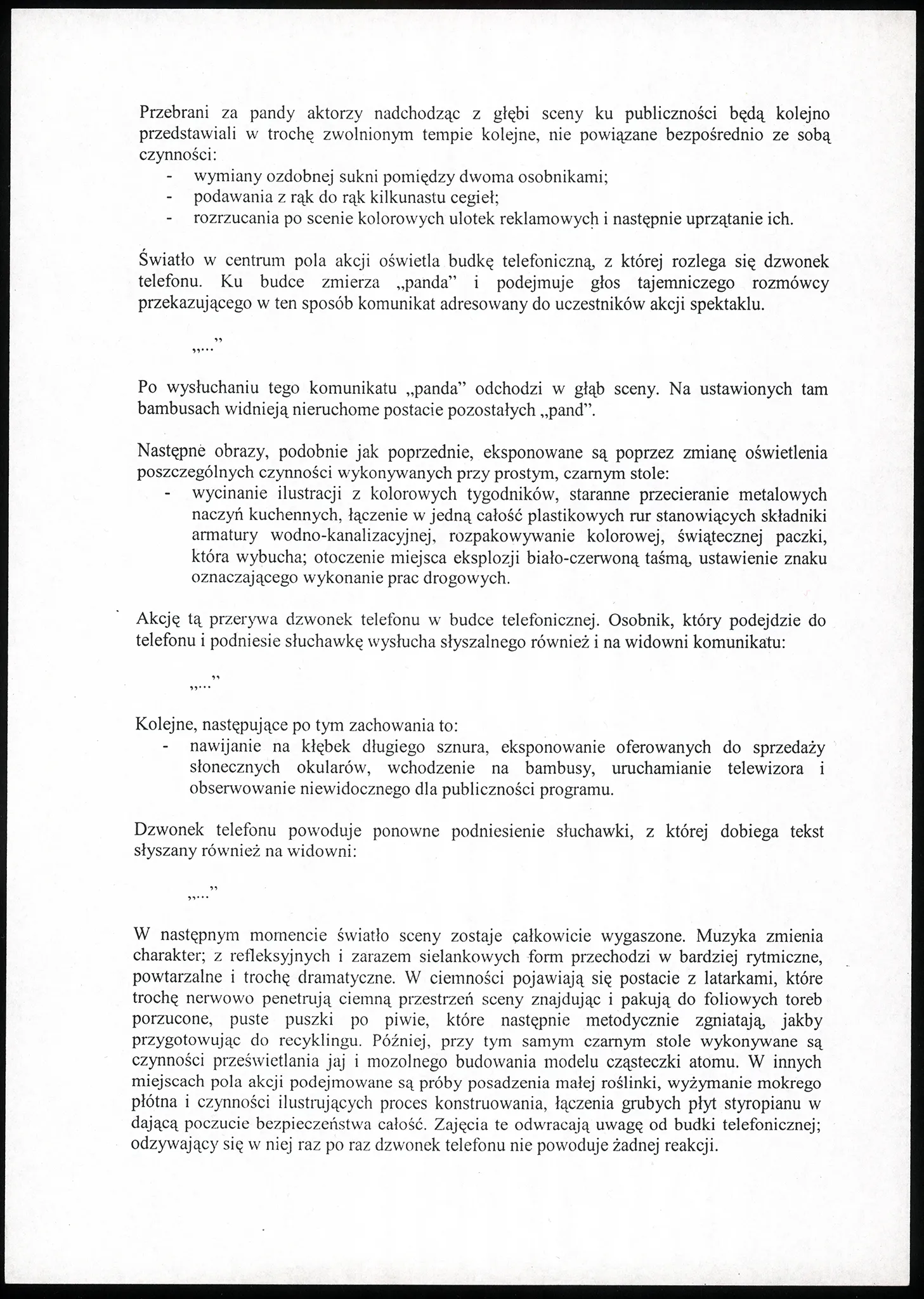 Relacje pomiędzy aktorami nie miały charakteru dialogowego. Powolny, monotonny rytm przedstawienia prostych czynności miał medytacyjny charakter mantry, stanowiącej raczej symboliczne zaklęcie wypowiadane w imię idei życia czynnego niż czynność służącą doraźnym celom. W ciągu całego spektaklu postacie aktorów były przesłonięte figurami niedźwiedzi panda, co dawało możliwość bardziej wyraźnego oddzielenia gestu, rodzaju czynności (zachowań) od banalnego kontekstu ludzkiej codzienności. Ideę spektaklu wyrażały również komentarze słowne dobiegające z symbolizującej komunikację ze światem zewnętrznym czerwonej budki telefonicznej ustawionej w centrum sceny.
