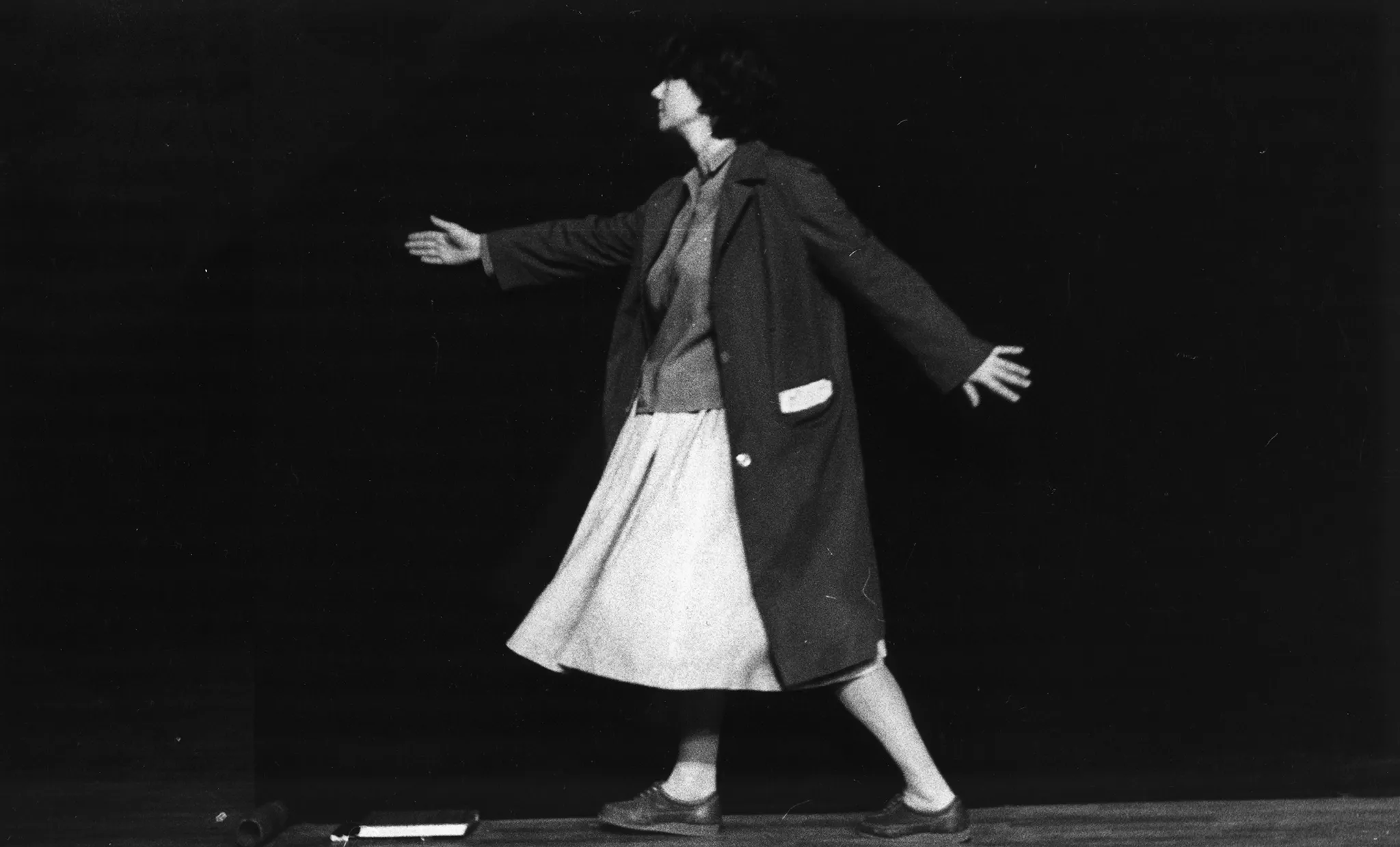 Na scenie stoi zwrócona profilem w stronę widza aktorka. Ubrana jest w krótkie skórzane buty, biała spódnicę, szary sweter i czarny rozpięty płaszcz. Wyciąga ręce na boki. Na podłodze obok aktorki leżą trudne do określenia przedmioty.
