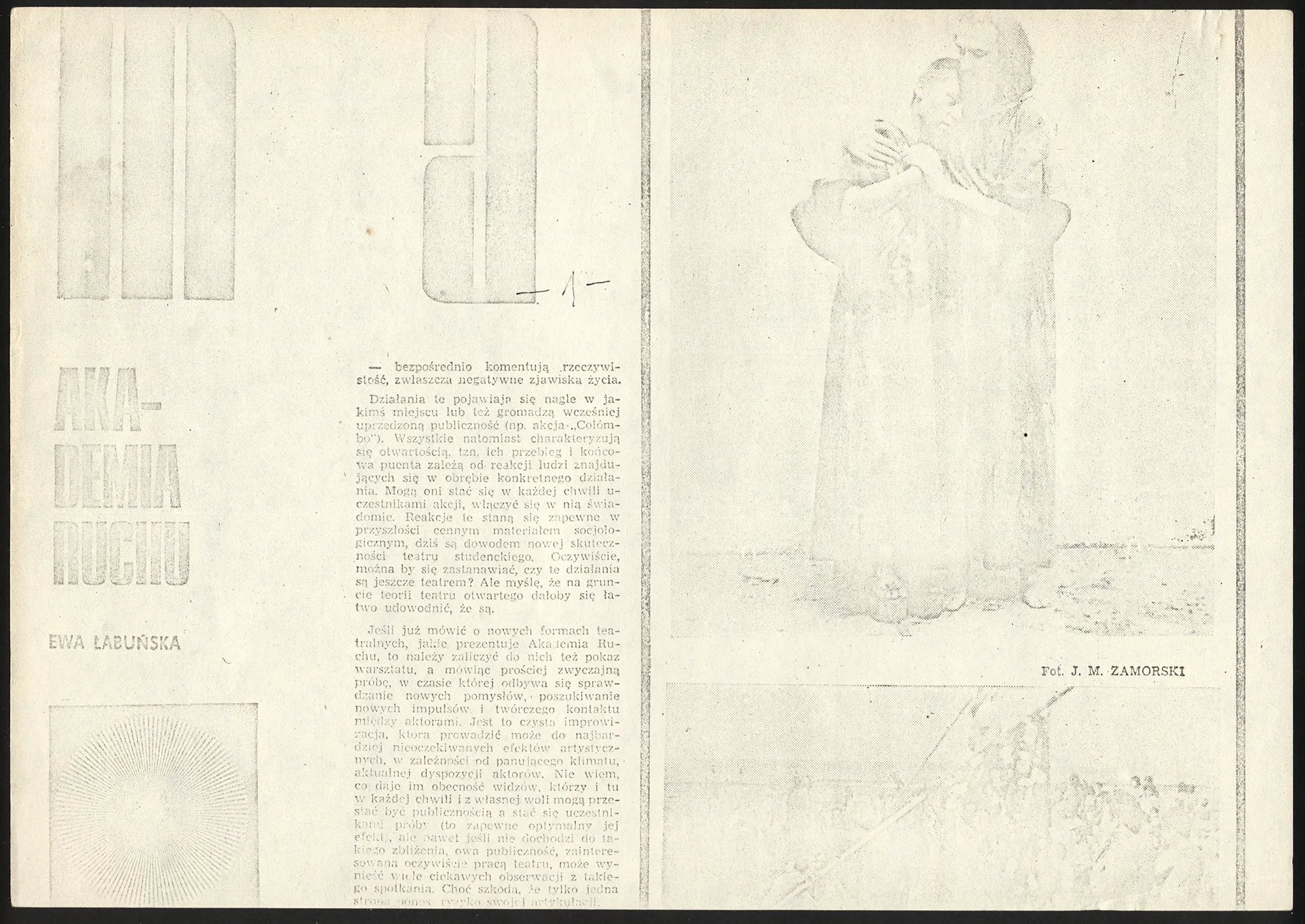 Półimprowizowany spektakl uliczny przedstawiający zniekształcony w świadomości potocznego odbiorcy stereotyp masowej informacji. Materiałem doraźnie inspirującym treści Lekcji były codzienne gazety. Spektakl, będący kreacją zbiorową zespołu, został po raz pierwszy zrealizowany w otwartej przestrzeni Warszawy, na rogu ulic Żelaznej i Miedzianej. Był to równocześnie początek regularnych działań teatru ulicznego w Polsce w przestrzeni otwartej życia codziennego (poza konwencją festynów, festiwali itp.).