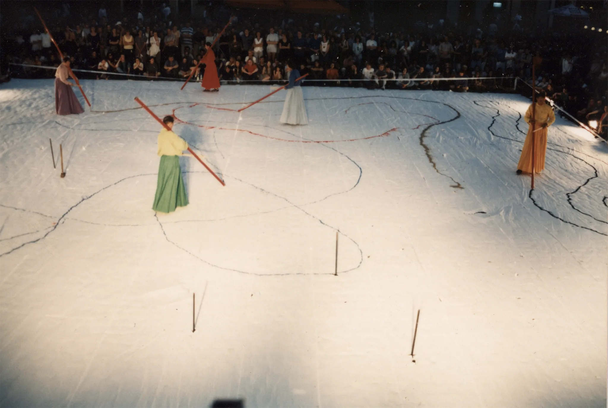 Duża biała scena ustawiona w przestrzeni miejskiej. Scena wygląda, jakby był na niej śnieg. Na scenie stoi czterosoobowa grupa aktorów i aktorek ubranych w kolorowe suknie w stylu azjatyckim. Trzymają w rękach długie czerwone kije i rysują wzory na scenie. W tle pod budynkami stoi publiczność zwrócona twarzą w stronę widza.