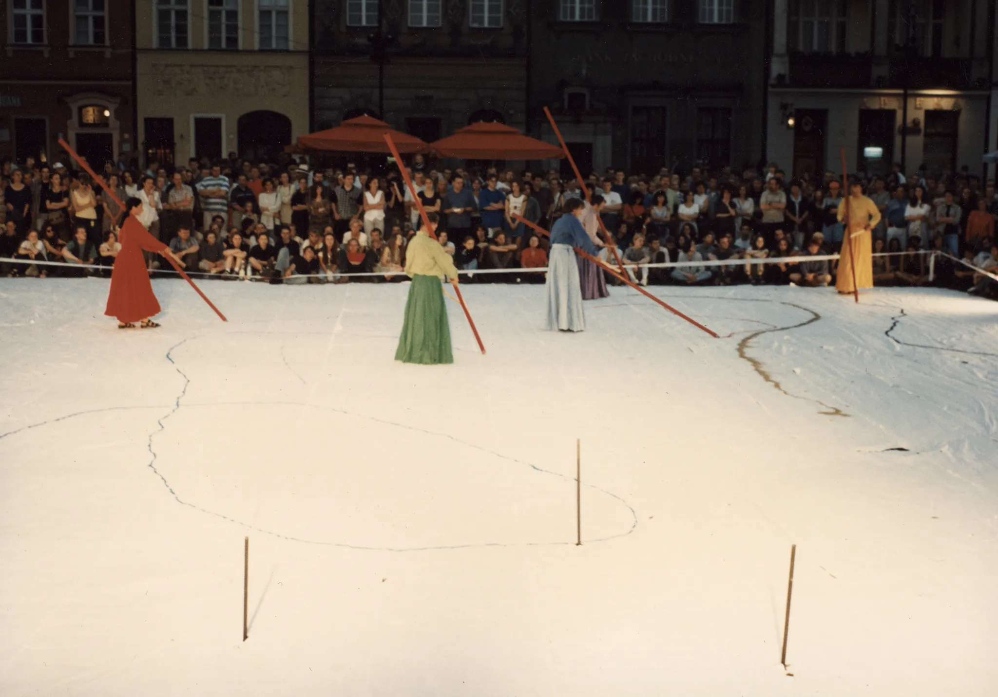 Duża biała scena ustawiona w przestrzeni miejskiej. Scena wygląda, jakby był na niej śnieg. Na scenie stoi czterosoobowa grupa aktorów i aktorek ubranych w kolorowe suknie w stylu azjatyckim. Trzymają w rękach długie czerwone kije i rysują wzory na scenie. W tle pod budynkami stoi publiczność zwrócona twarzą w stronę widza.