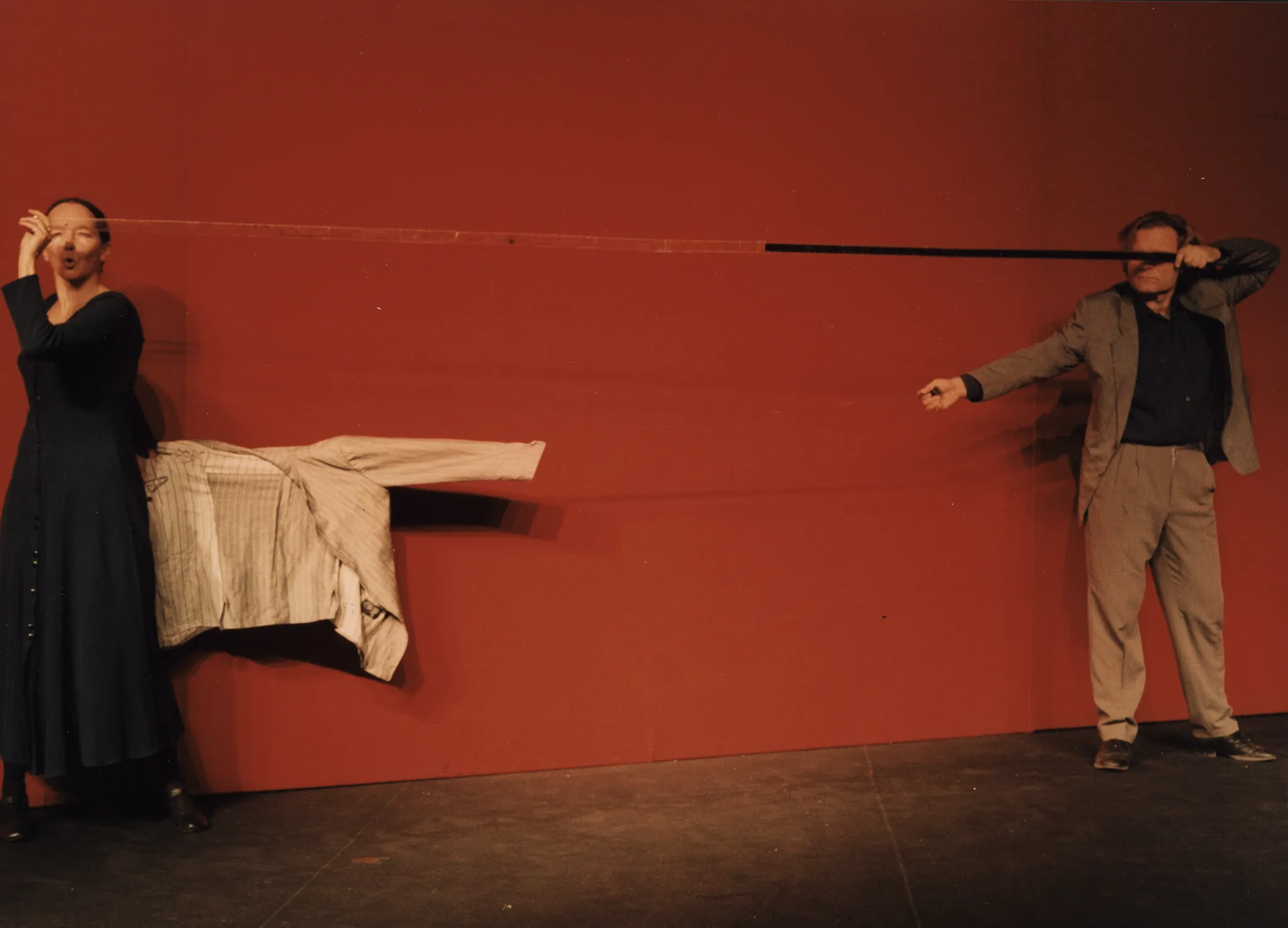 Na tle czerwonej ściany plecami do siebie stoją aktor i aktorka. Oboje ubrani są w czarne spódnice i czarna koszule. Na ubraniach mają zawieszone białe unoszące się patyki.