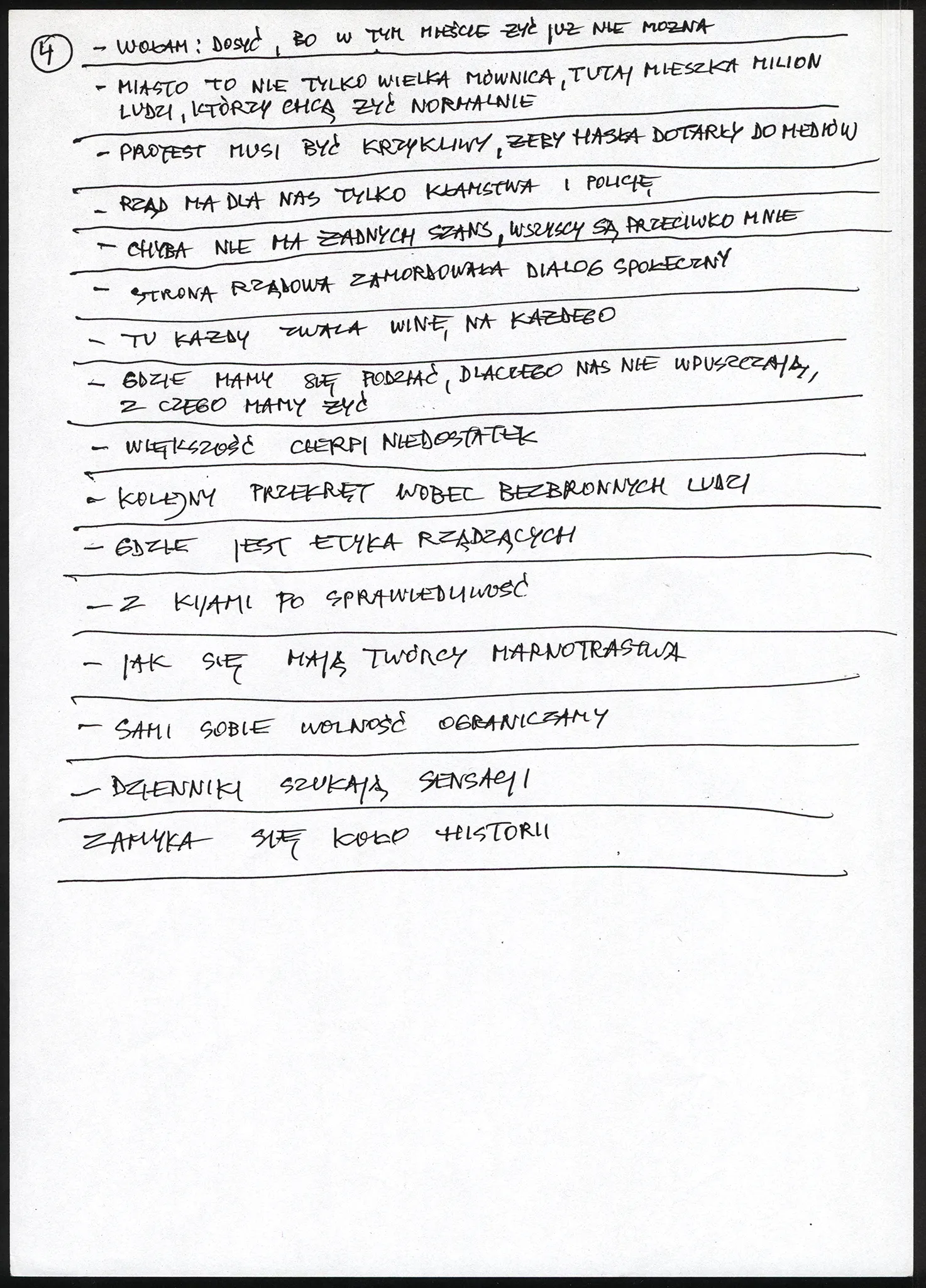 Jedna z akcji zrealizowanych w okresie czerwiec–lipiec 1993 roku, na Międzynarodowym Festiwalu Teatralnym Malta w Poznaniu. Akcja zrealizowana na białej powierzchni sztucznego stoku narciarskiego nad jeziorem Malta. Istotną rolę w jej przebiegu odgrywała warstwa dźwiękowa – chór skandował rytmicznie skargi Polaków zestawiane z cytatów z rozmów telewizyjnych i radiowych, wypowiedzi prasowych, zasłyszanych na ulicy rozmów – zapisywanych w ciągu miesiąca poprzedzającego akcję.