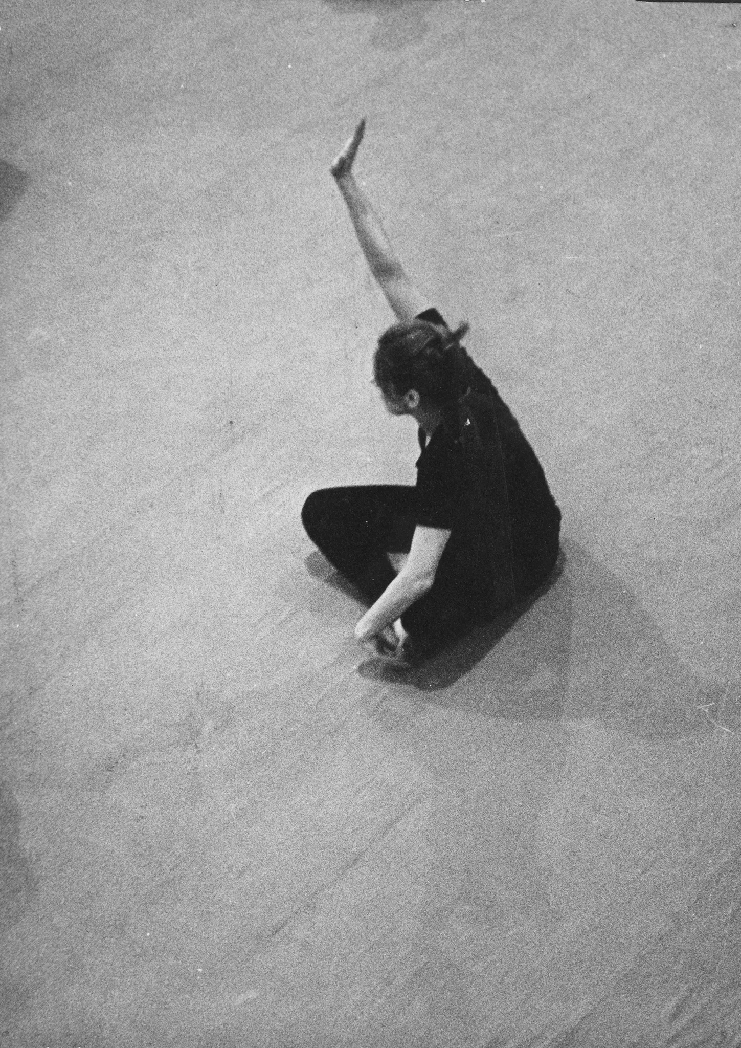 Aktorka siedzi w siadzie skrzyżnym. Widać ją od góry. Aktorka unosi jedną rękę. Ubrana jest w czarne spodnie i czarną podkoszulkę.