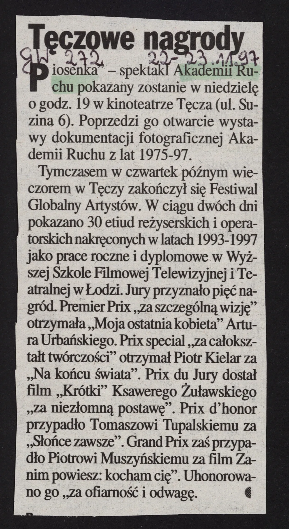 recenzja Relacja prasowa – „Gazeta Wyborcza” 22-23.11.97 data 1997 format kolor kolor osoby widoczne miejsce copyright czas trwania opis