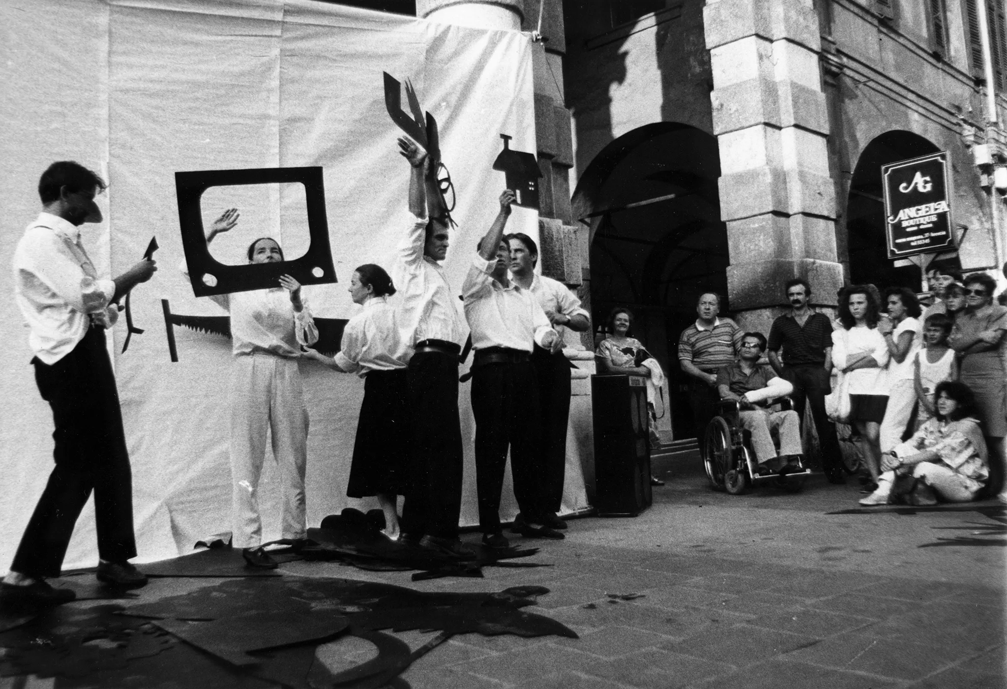 Przestrzeń miejska. Pod białą płachtą zawieszoną na kolumny budynku stoi sześcioosobowa grupa aktorów i aktorek. Czterech aktorów ubranych jest w czarne spodnie i białe koszule. Jedna aktorka ubrana jest w jasne spodnie i białą koszulę. Druga aktorka ubrana jest w czarną spódnicę i białą koszulę. Wszyscy trzymają w rękach dwuwymiarowe czarne rekwizyty wyglądające na wycięte z papieru, takie jak telewizor, piła do cięcia drewna i domek. Po prawej stronie stoją widzowie oglądający aktorów. Za ich plecami stoi budynek.