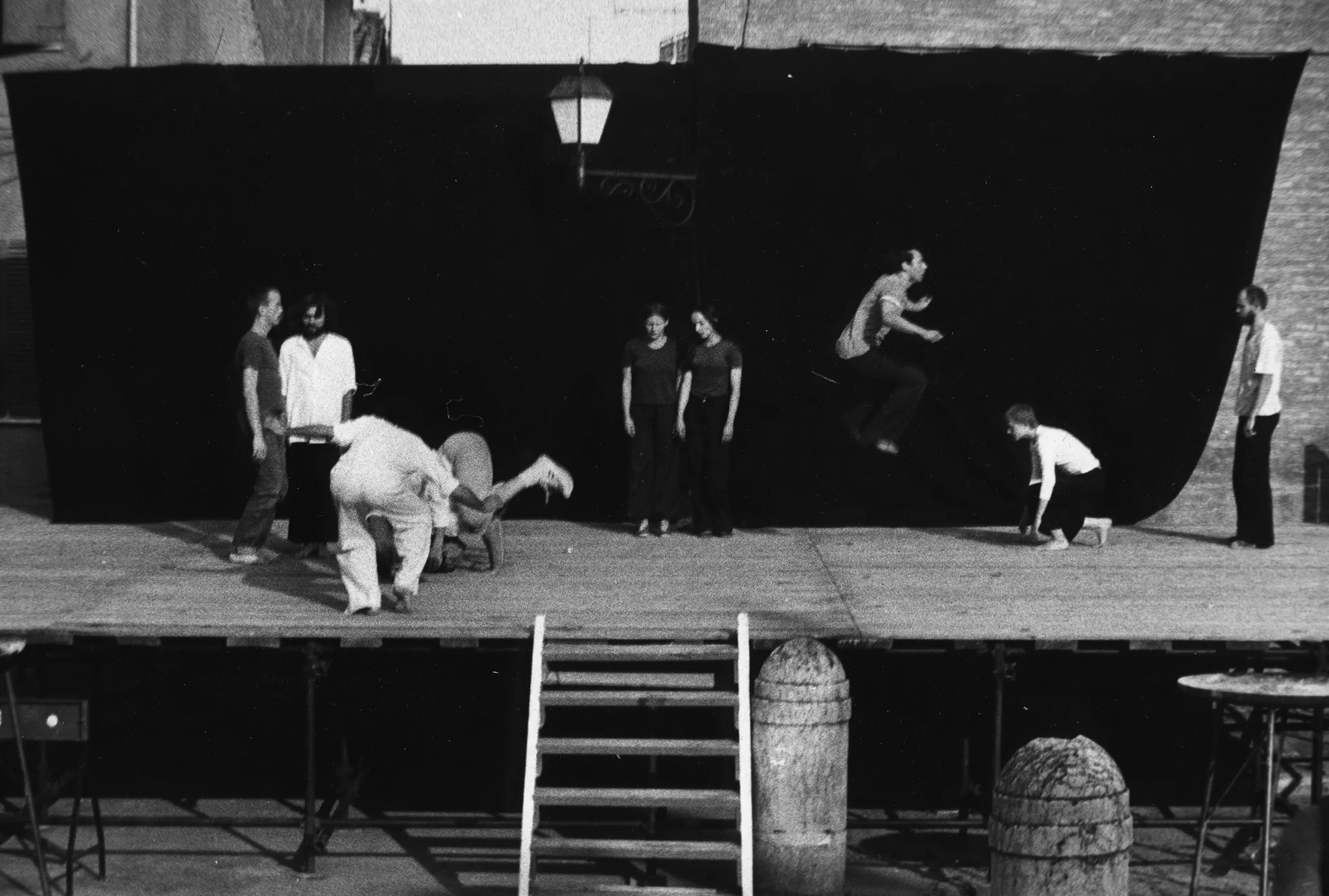 Scena plenerowa. Na scenę prowadzą drewniane schody. Z tyłu sceny ściana z czarnej płachty. Pośrodku, zza płachty wystaje latarnia. Na scenie stoją aktorzy i aktorki w różnych działaniach. Turlają się, skaczą i stoją w miejscu. Wyglądają, jakby mieli na sobie prywatne ubrania. Wspólnie tworzą choreograficzną kompozycję.