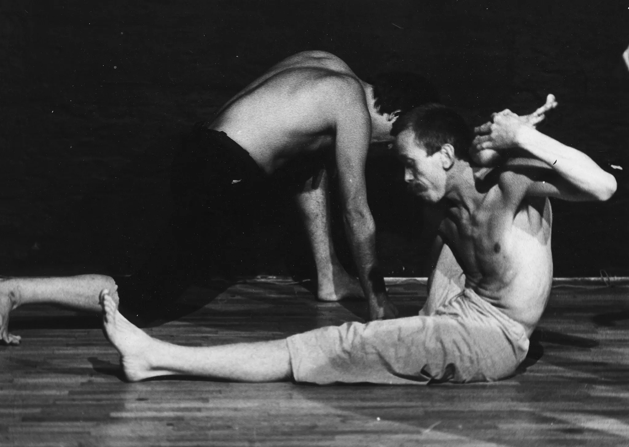 Aktor, zwrócony profilem do widza, siedzi na podłodze. Ubrany jest w jasne spodenki, ma nagi tors. Jest boso. Jedną nogę ma wyprostowanę, drugą trzyma sa swoją głową. Za aktorem klęczy podparty rękami o podłogę drugi aktor. Ubrany jest w czarne spodenki, ma nagi tors. Jest słabo widoczny.