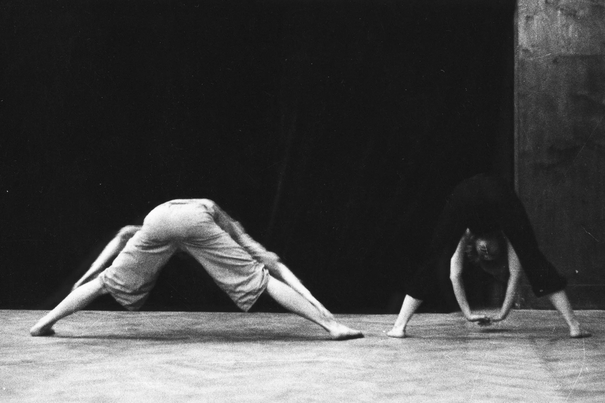 Aktor i aktorka stoją obok siebie. Aktor stoi po lewej stronie, aktorka po prawej. Mają nogi szeroko rozstawione i rozciągają się schylając głowę w stronę podłogi. Aktor ubrany jest w jasne ubrania, aktorka w czarne. Oboje są boso.