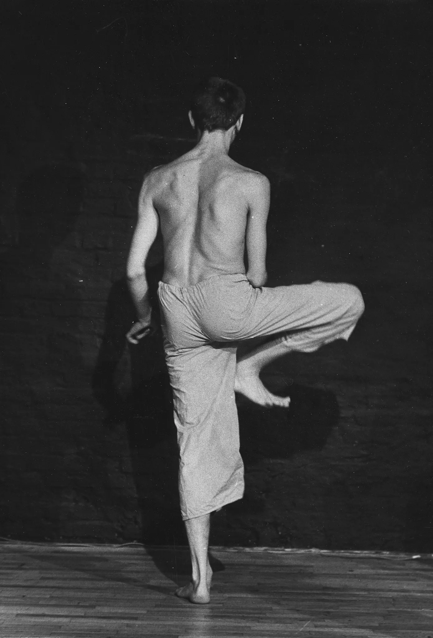 Aktor stoi zwrócony plecami do widza. Ubrany jest w jasne spodenki, ma nagi tors. Jest boso. Stoi na jednej nodze. Jego druga noga jest zgięta w kolanie.