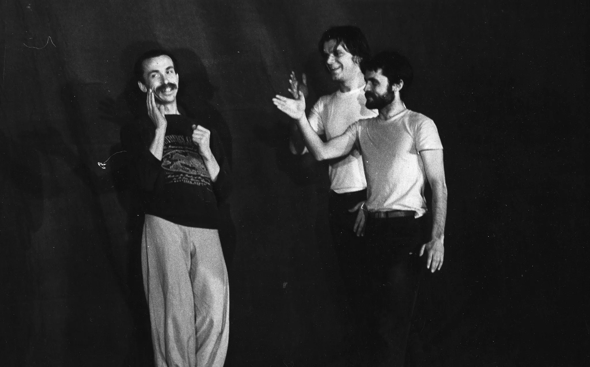 Niewyraźne, rozmazane zdjęcie. Po lewej stronie klęczy aktor zwrócony profilem do widza. W centrum stoi na ugiętych nogach, skulony aktor obejmujący sam siebie rękami. Po jego lewej i prawej stronie niewyraźne sylwetki aktorów.