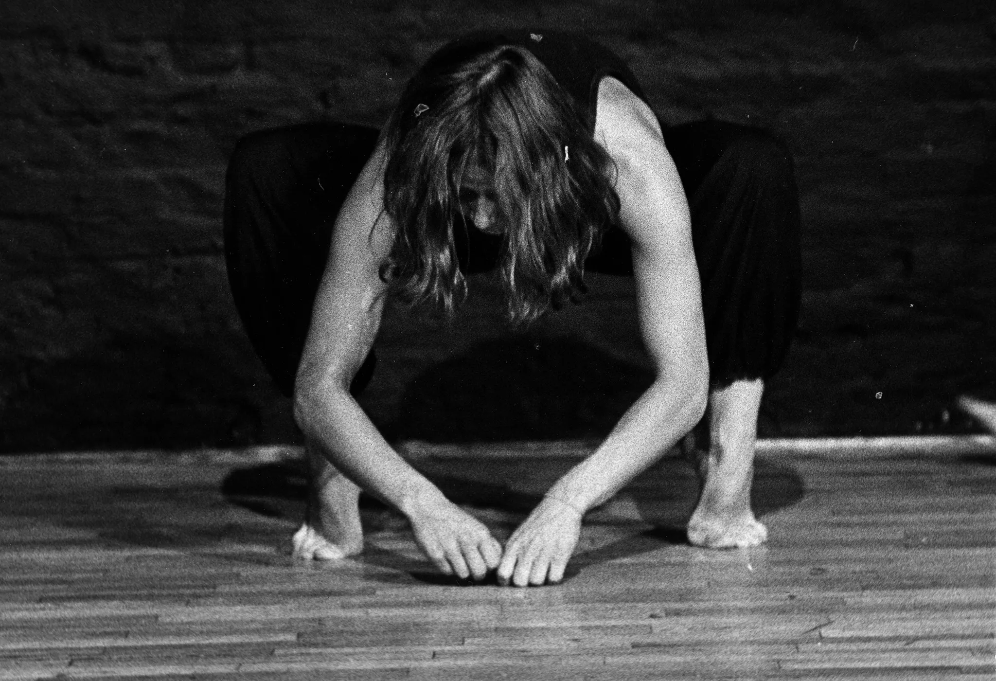 Aktorka, mocno pochylona w stronę podłogi, kuca stojąc na palcach. Dłońmi lekko dotyka podłogi. Ubrana jest w czarne spodnie i czarną koszulkę na ramiączka. Jest boso.