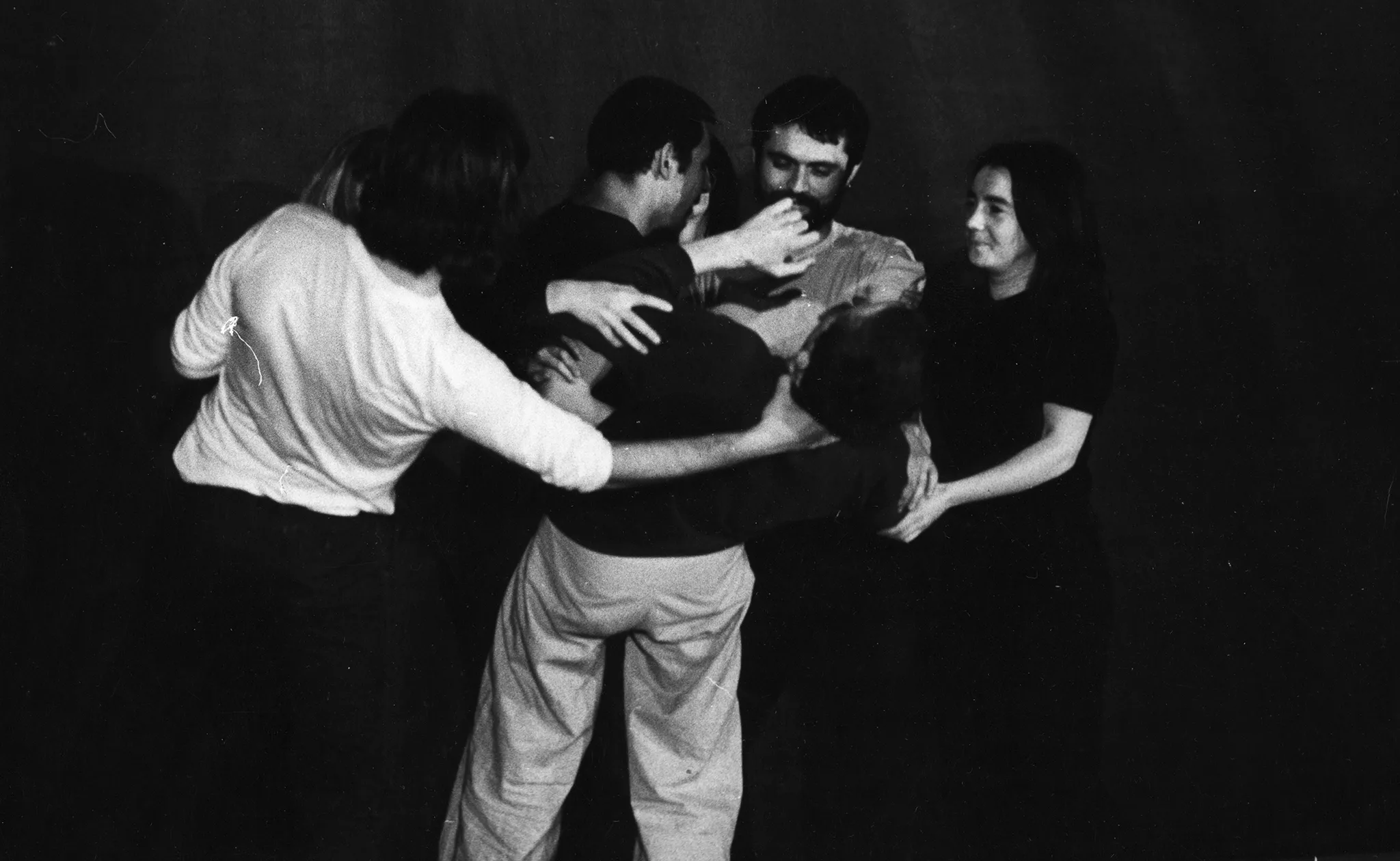 Grupa aktorów i aktorek. Na pierwszym planie dwóch aktorów wykonuje akrobatyczne ruchy na podłodze. Za nimi, w dwóch parach stoją cztery aktorki. W każdej parze aktorki są zwrócone do siebie twarzami. W oddali przechodzi przez scenę słabo widoczny aktor. Aktorzy ubrani są w czarne spodenki, mają nagie torsy. Aktorki ubrane są w czarne spodnie i czarne koszulki. Wszyscy są boso.