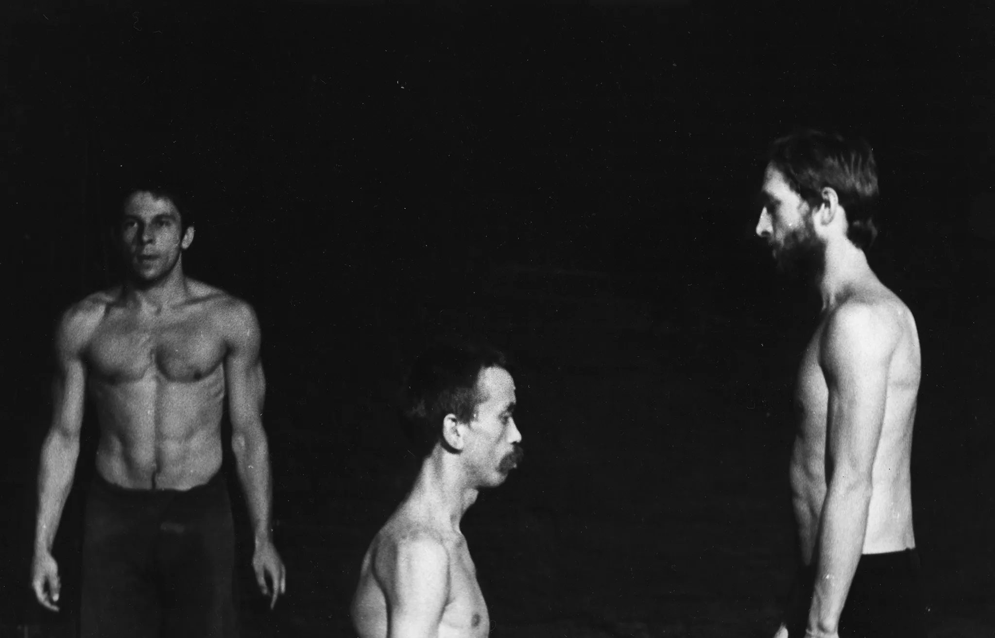Na plecach leży aktor. Ubrany jest w jasne spodenki, ma nagi tors. Patrzy w sufit. Za nim klęczy dwóch aktorów. Ubrani są w ciemne spodenki, mają nagie torsy. Klęczą naprzeciwko siebie i patrzą na siebie nawzajem. Obaj mają jedną rękę wyciągniętą do boku.