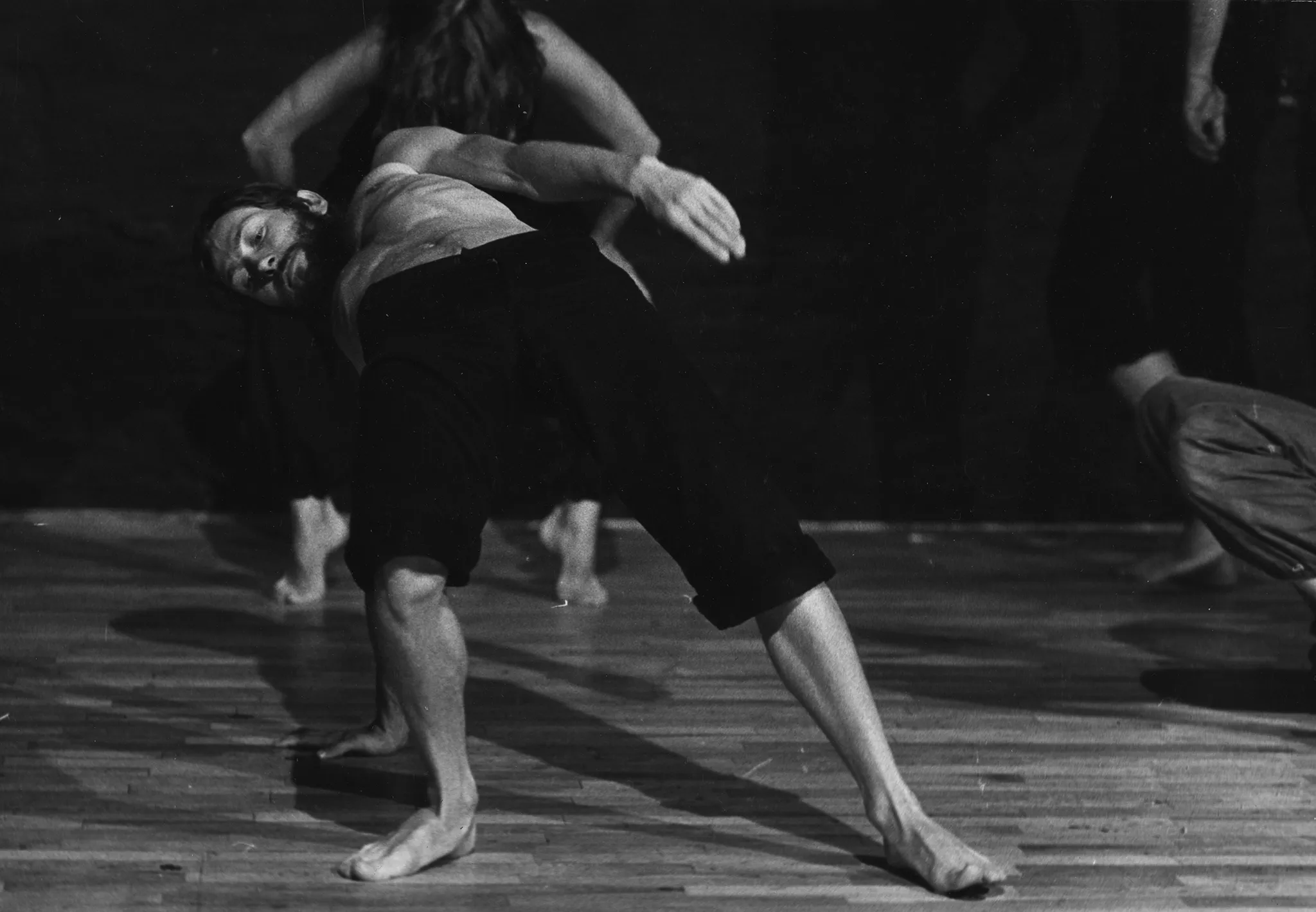 Niewyraźne, rozmazane zdjęcie. Po lewej stoi aktor. Jest ubrany w czarne spodenki, ma nagi tors. Jest boso. Schyla się ku podłodze, jakby się rozciągał. Po prawej stronie stoi i siedzi grupa aktorek. Są ubrane na czarno, są boso.