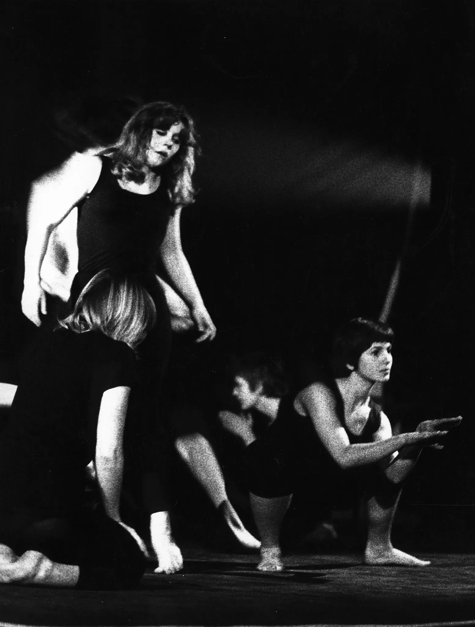 Grupa aktorów i aktorek. Na pierwszym planie dwóch aktorów wykonuje akrobatyczne ruchy na podłodze. Za nimi, w dwóch parach stoją cztery aktorki. W każdej parze aktorki są zwrócone do siebie twarzami. W oddali przechodzi przez scenę słabo widoczny aktor. Aktorzy ubrani są w czarne spodenki, mają nagie torsy. Aktorki ubrane są w czarne spodnie i czarne koszulki. Wszyscy są boso.