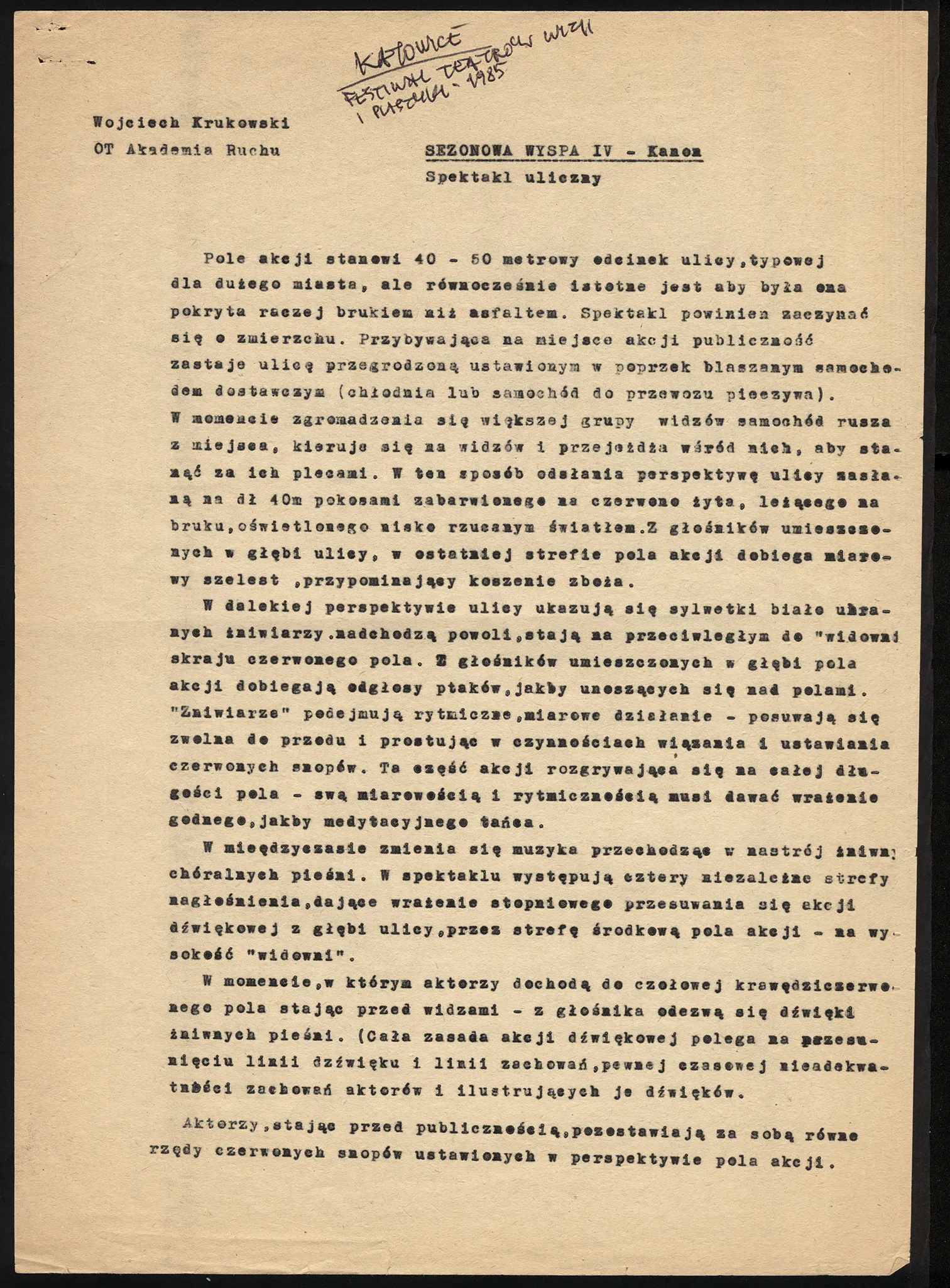 Pierwsza z serii akcji, której kolejne warianty były opatrywane numerami lub nazwami. Akcję z 1986 roku nazywano także Kanonem lub Czerwony zbożem. Sześćdziesięciometrowej długości ulica przylegająca do budynku Teatru Śląskiego w Katowicach została całkowicie zasłana zbożem polakierowanym na czerwono. Wykonawcy akcji, posuwając się z głębi ulicy ku stojącej u jej początku publiczności zbierali zboże (przy wtórze odtwarzanych nagrań żniwnych pieśni litewskich), wiążąc je w snopy, ustawiając na bruku, posilając się z przyniesionych na „pole” dwojaków – i wreszcie śpiąc. W tym czasie zapalały się światła w oknach domków, przysypanych czerwoną słomą miniaturowych „miasteczek”. Śpiących „żniwiarzy” budził stukot młotków, którymi mężczyźni w długich płaszczach przybijali do czerwonej tablicy czerwone sprzęty przeciwpożarowe: wiadro, siekierę, blaszaną tłumicę ognia, łopatę – czerwoną milicyjną pałkę. W tym samym momencie stojący za plecami publiczności wóz piekarniczy zaczynał odjeżdżać – jego drzwi się otwierały, ukazując srebrzyste, puste, jaskrawo oświetlone wnętrze, w którym biało ubrana dziewczyna żonglowała dwoma bułeczkami. Niespodziewanie dla realizatorów akcji publiczność biegła za odjeżdżającym pustym – pozbawionym właściwego towaru – samochodem piekarniczym.