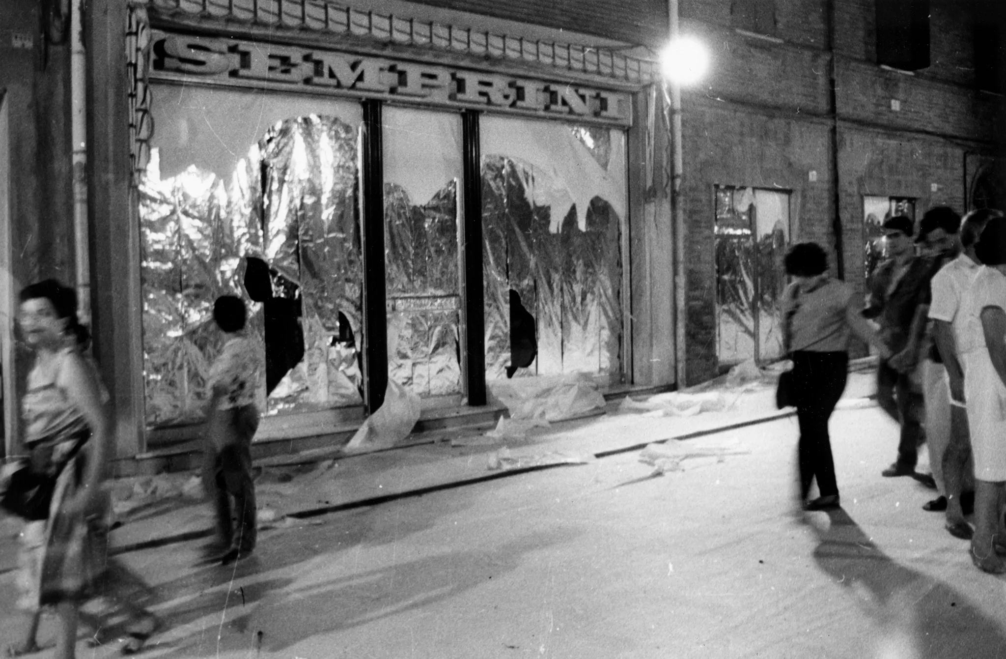 Trzy zdjęcia jedno pod drugim. Zdjęcie na górze przedstawia pustą ulicę między budynkami. Środkowe zdjęcie przedstawia szlaban i zakaz przejścia na ulicy. Zdjęcie na dole przedstawia poszarpaną witrynę sklepową. Na budynku widnieje napis "SEMPRINI".