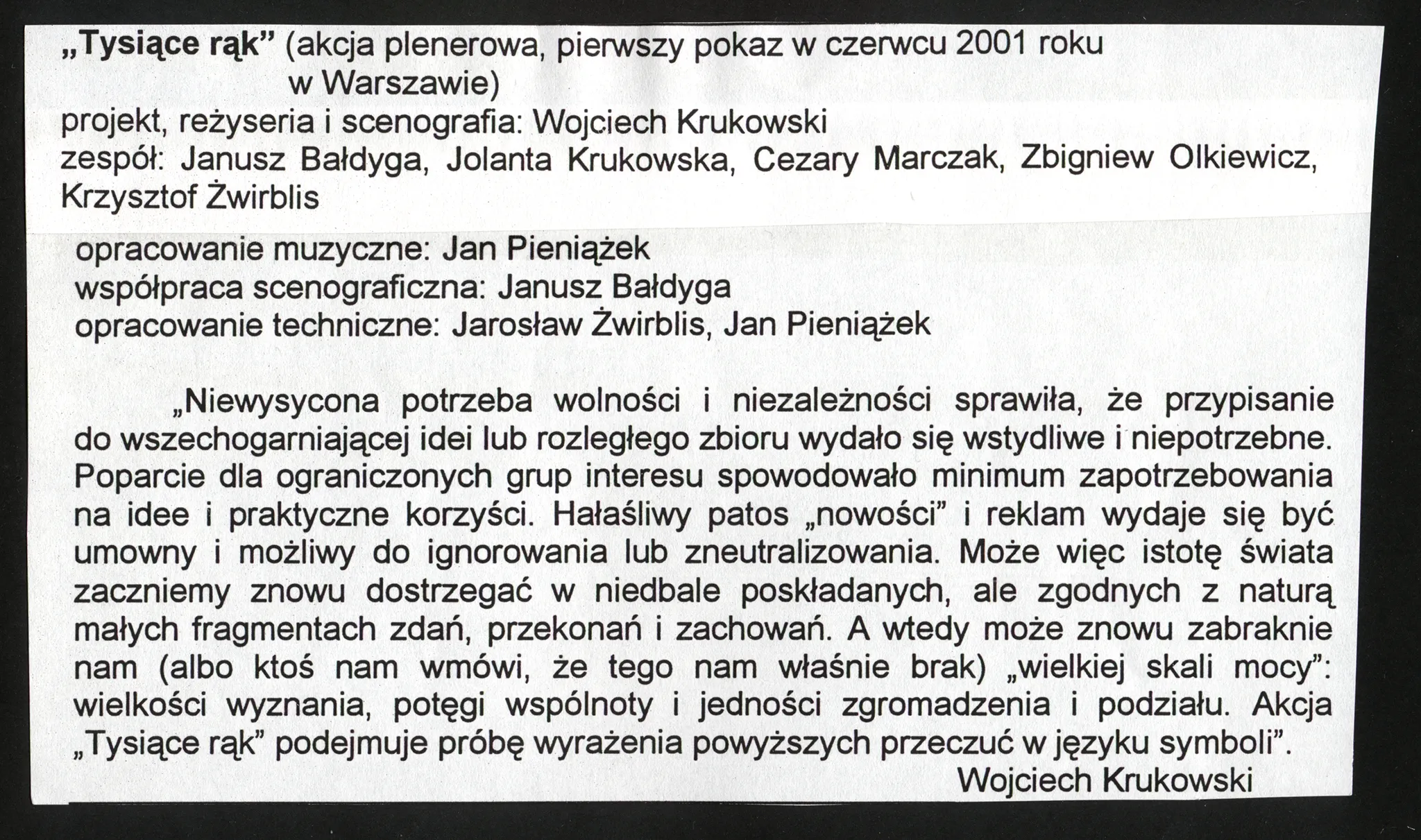 akcja Tysiace rąk (2001) Tysiace rąk → Tysiące rąk – opis opis, cz/b 2001 Tysiace rąk → Tysiące rąk, Mała scena, Tymczasem – ulotka ulotka, kolor Tysiace rąk → Tysiące rąk – notatki reżyserskie notatki reżyserskie, cz/b 2001 opis Tysiące rąk – opis data 2001 format kolor cz/b osoby widoczne miejsce copyright czas trwania opis