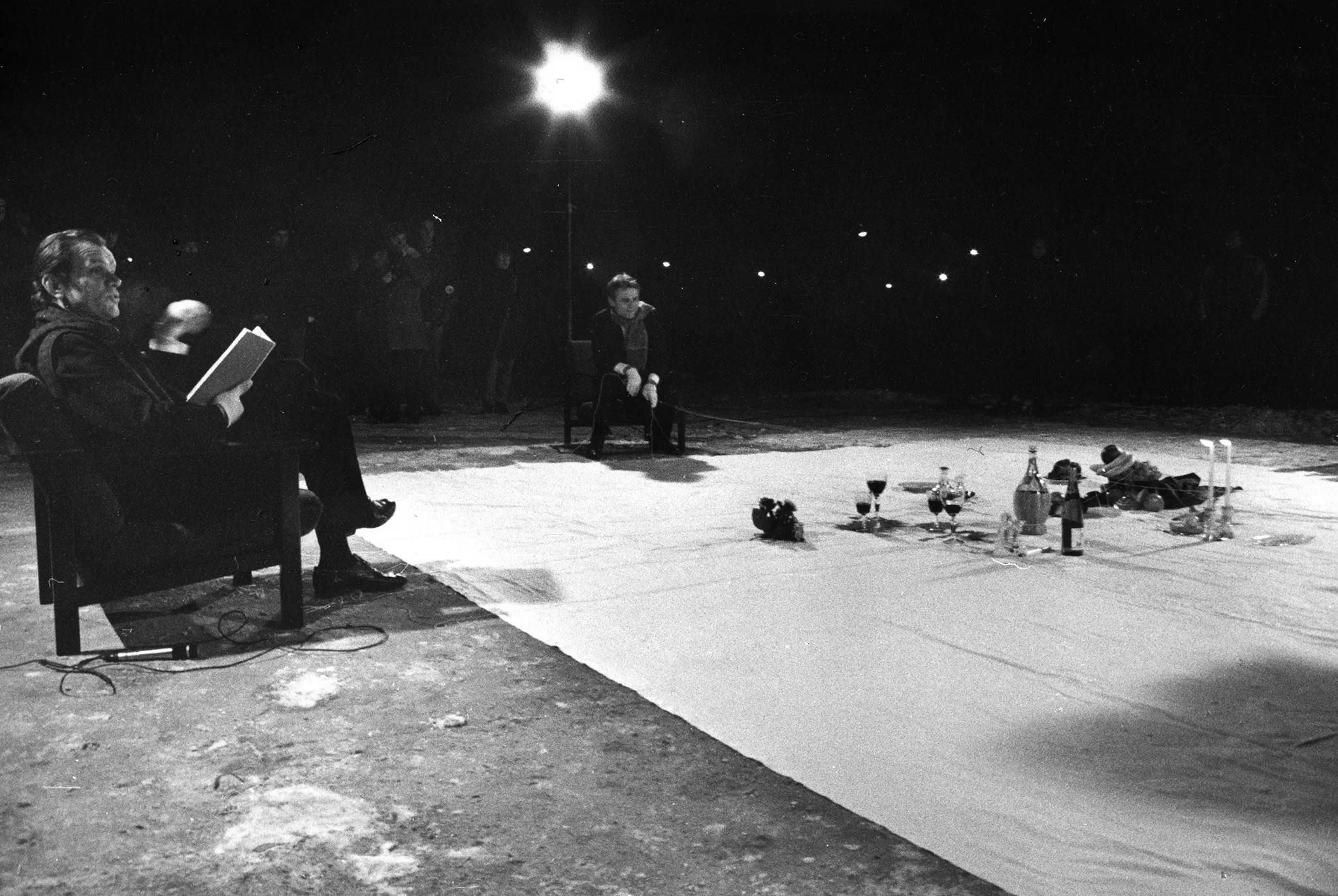 Na białej płachcie leżą przedmioty, takie jak kieliszki, świece, owoce i butelki. Po lewej stronie płachty na krześle siedzi aktor. Ubrany jest na czarno. W rękach trzyma książkę i mówi coś do aktora siedzącego na krześla po drugiej stronie płachty. Z tyłu płachty na krześle siedzi aktor trzymający w rękach napiętą linkę. Za jego plecami stoi reflektor i grupa widzów.